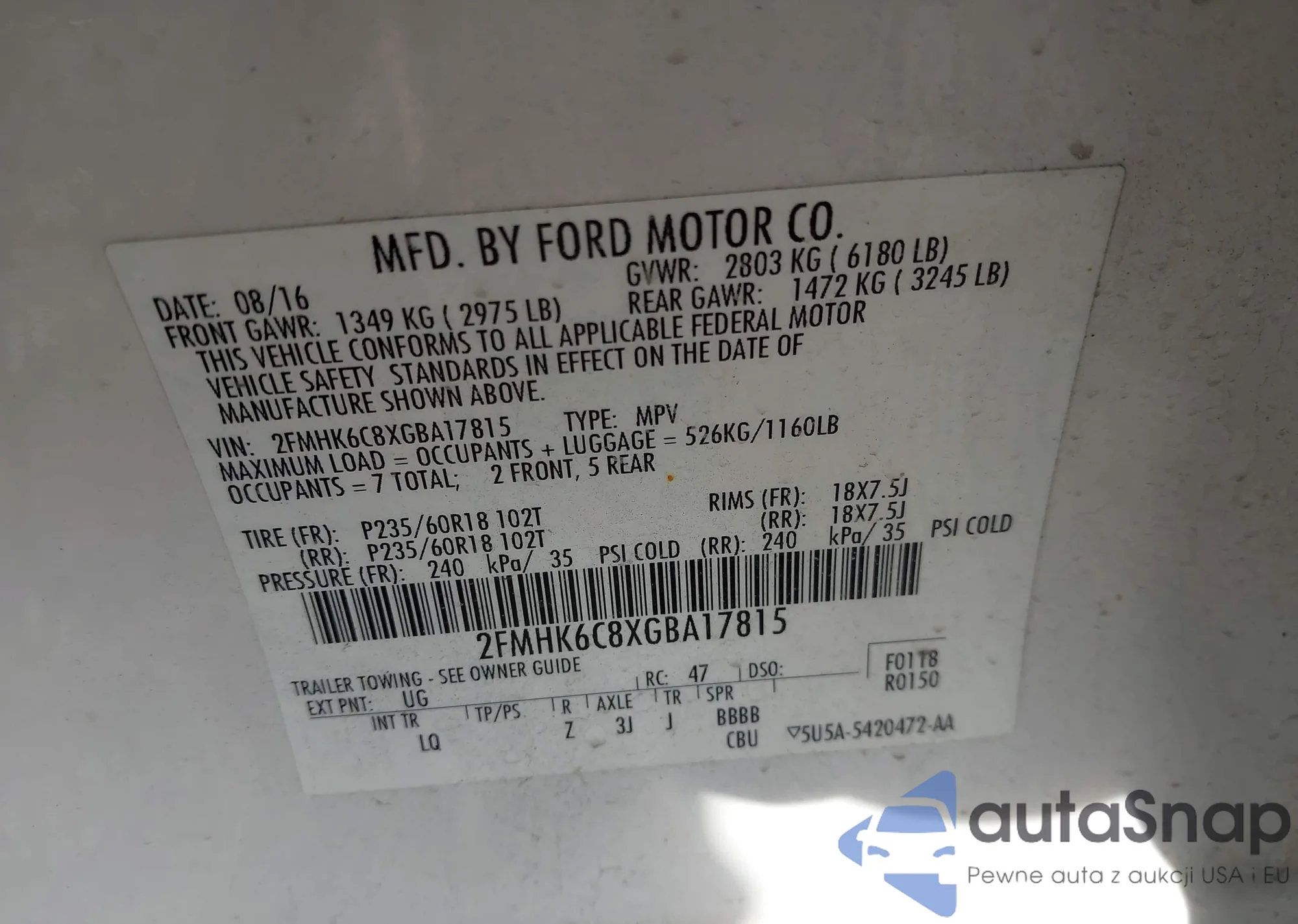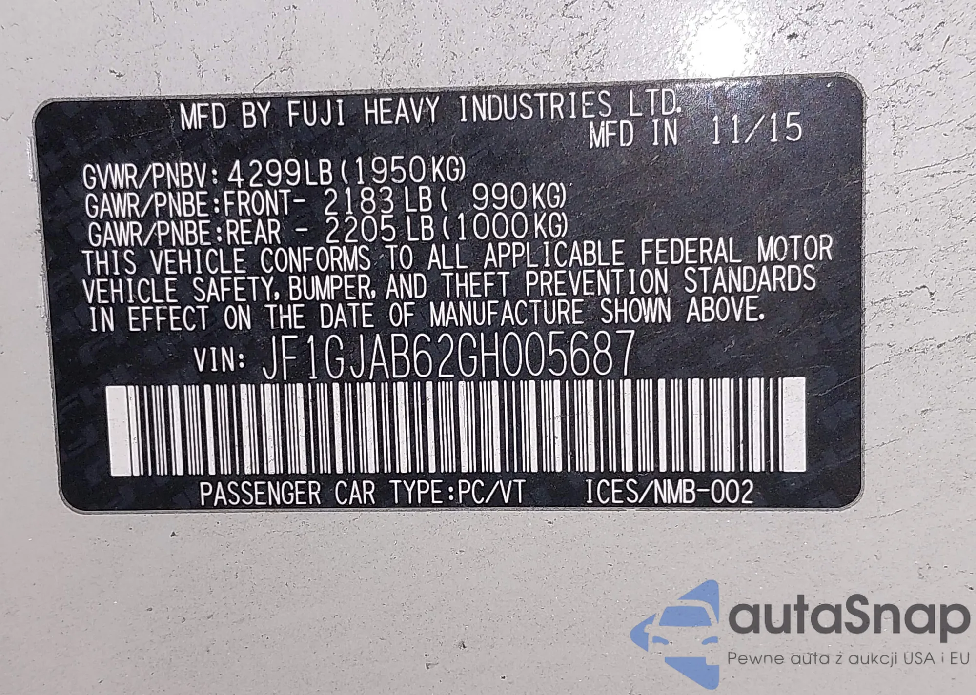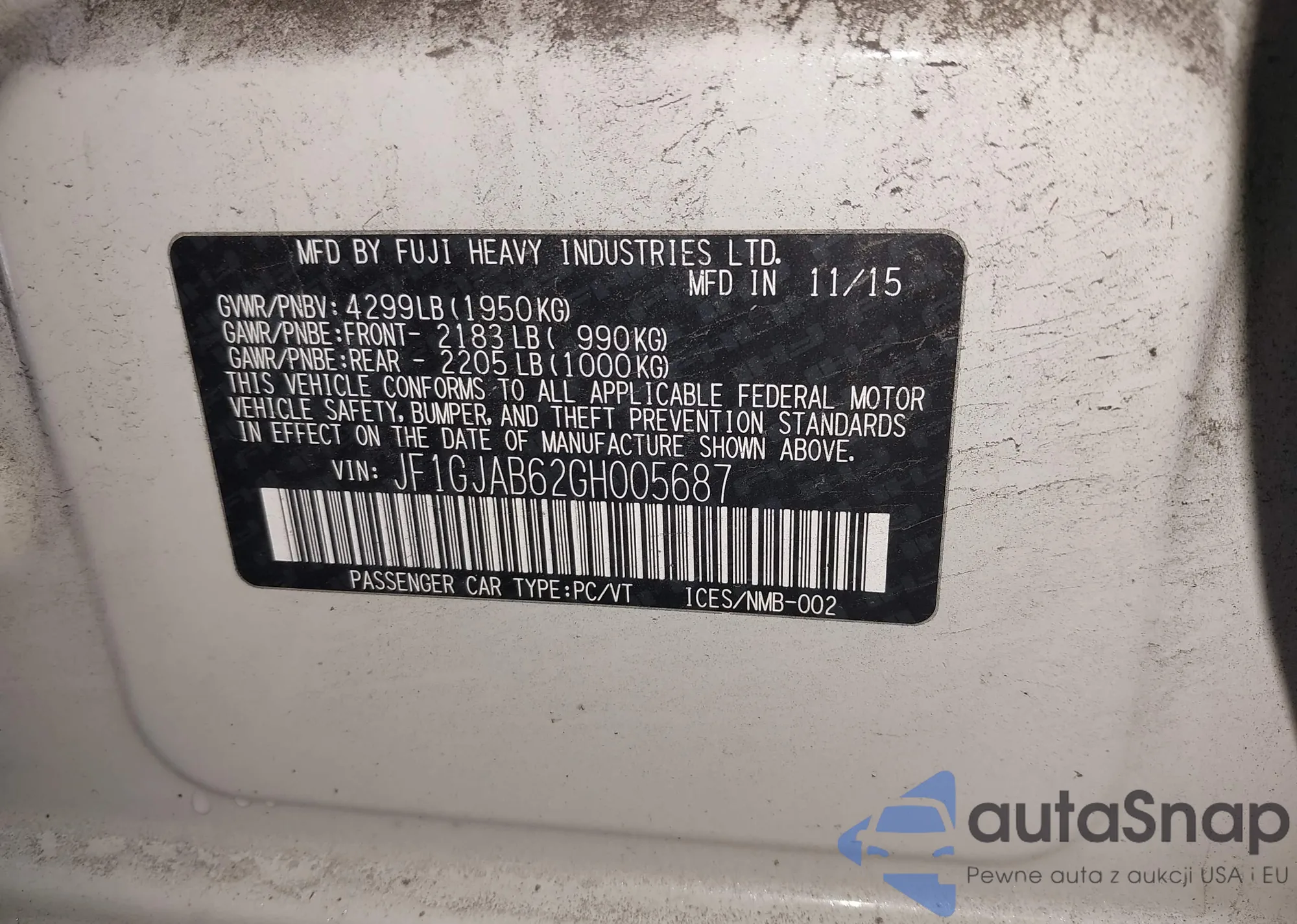 LOT: 43920825 VIN: JF1GJAB62GH005687
