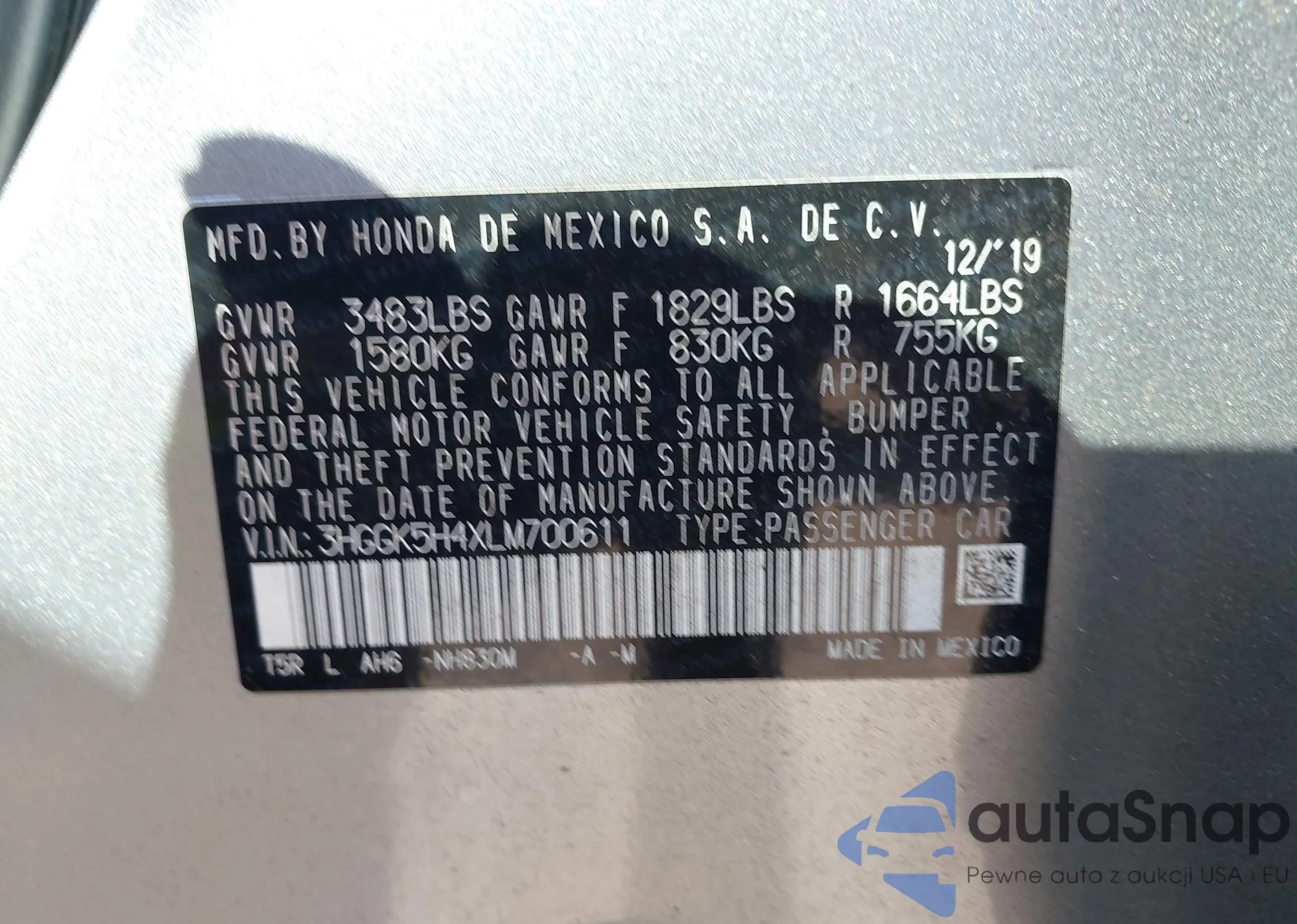 • VIN 3HGGK5H4XLM700611