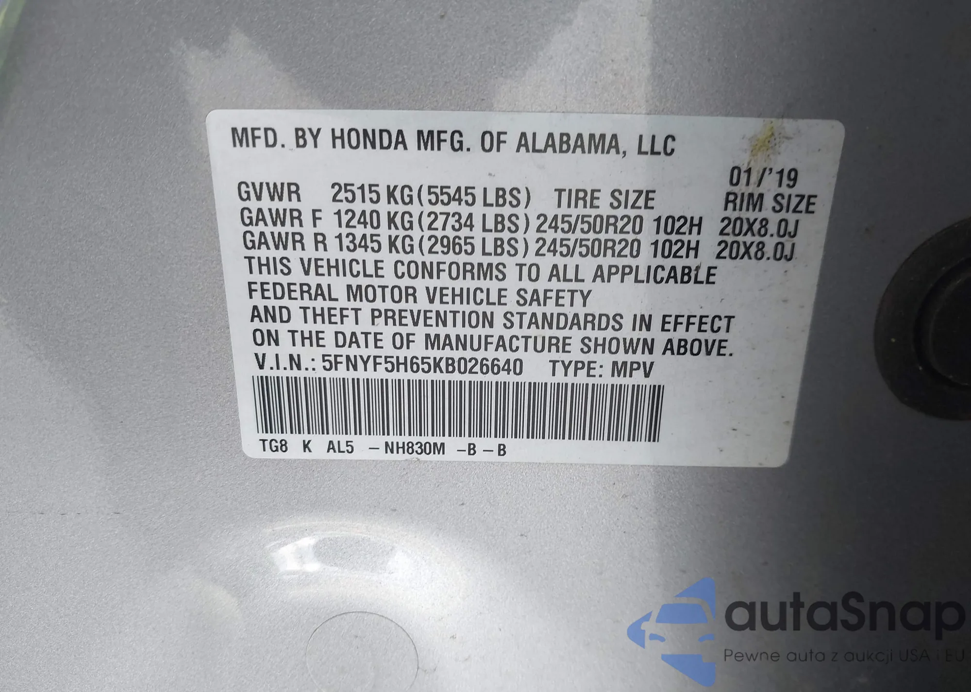 LOT: 43815658 VIN: 5FNYF5H65KB026640