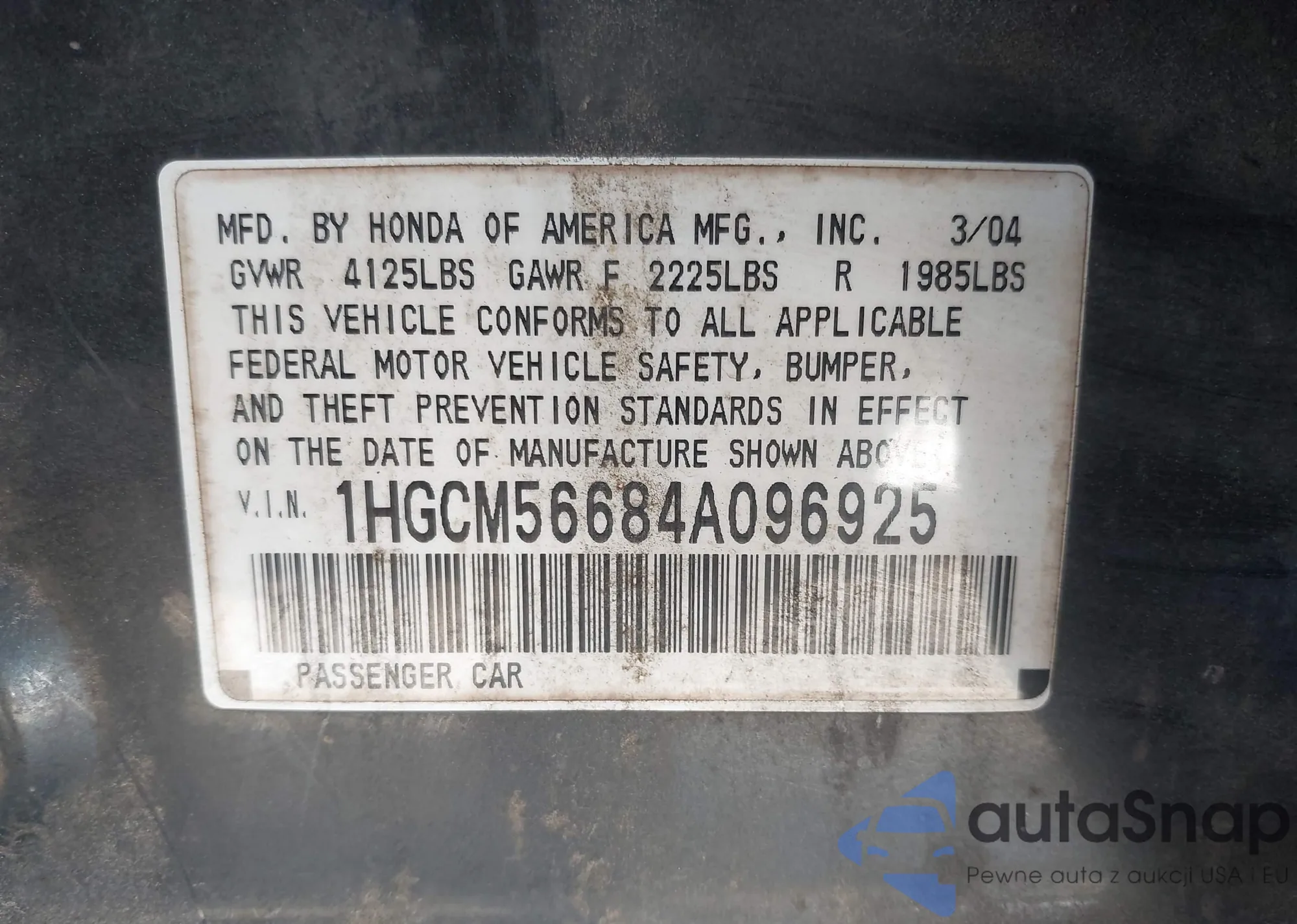 LOT: 44020844 VIN: 1HGCM56684A096925