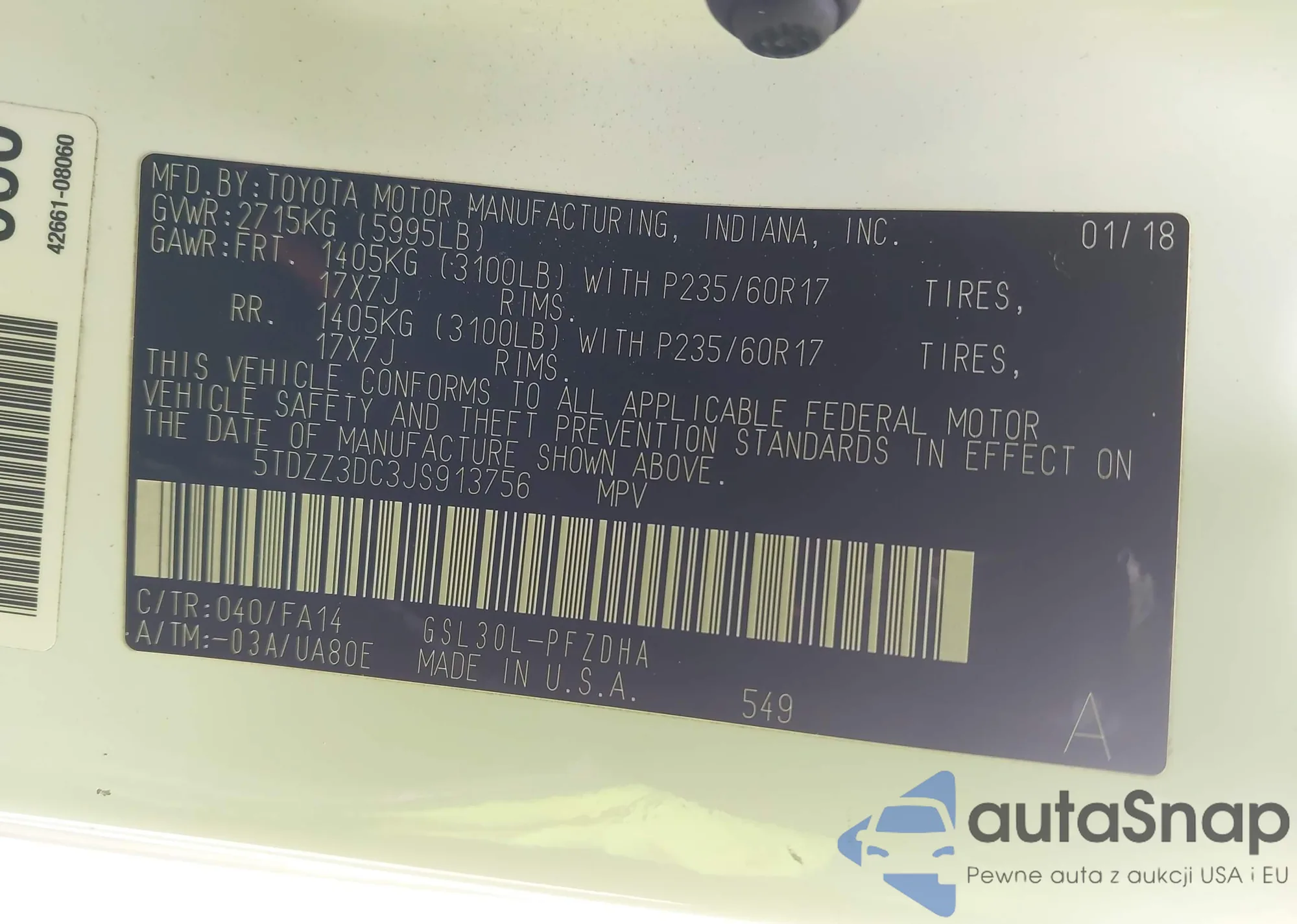 • VIN 5TDZZ3DC3JS913756