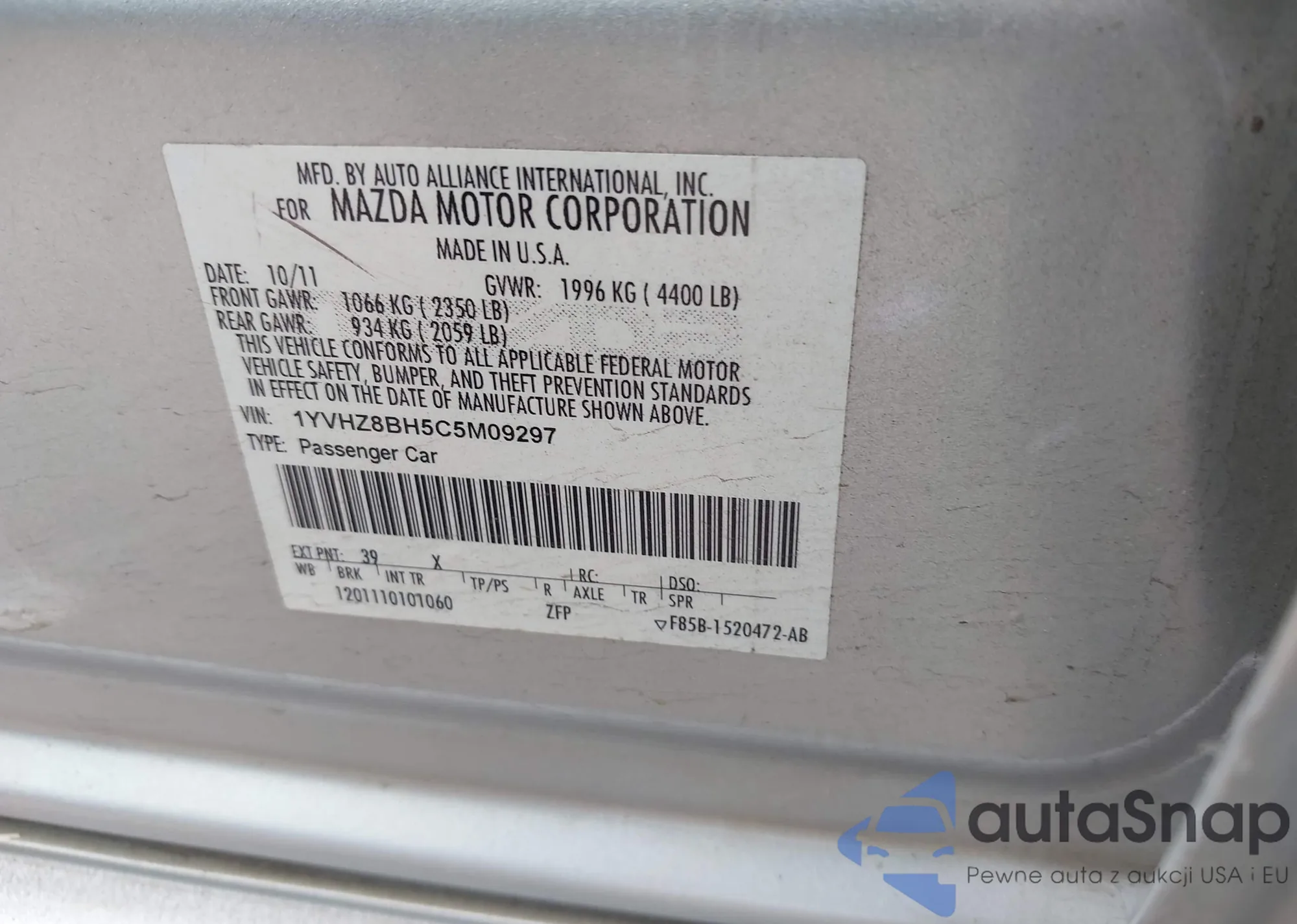 • VIN 1YVHZ8BH5C5M09297