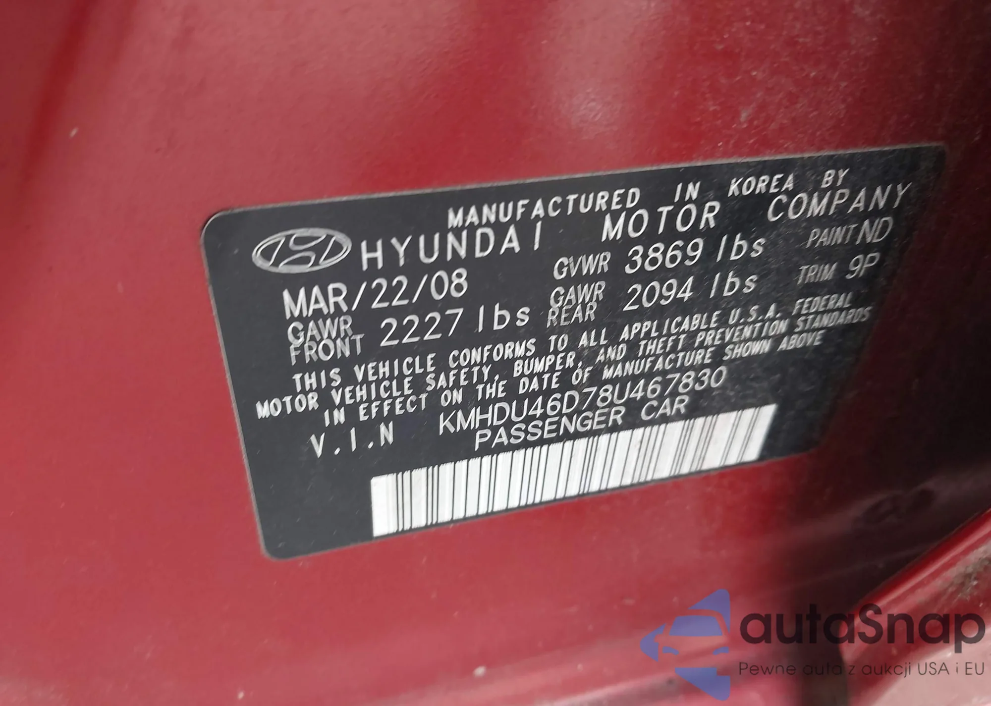 LOT: 44043619 VIN: 2HGFA16508H327989