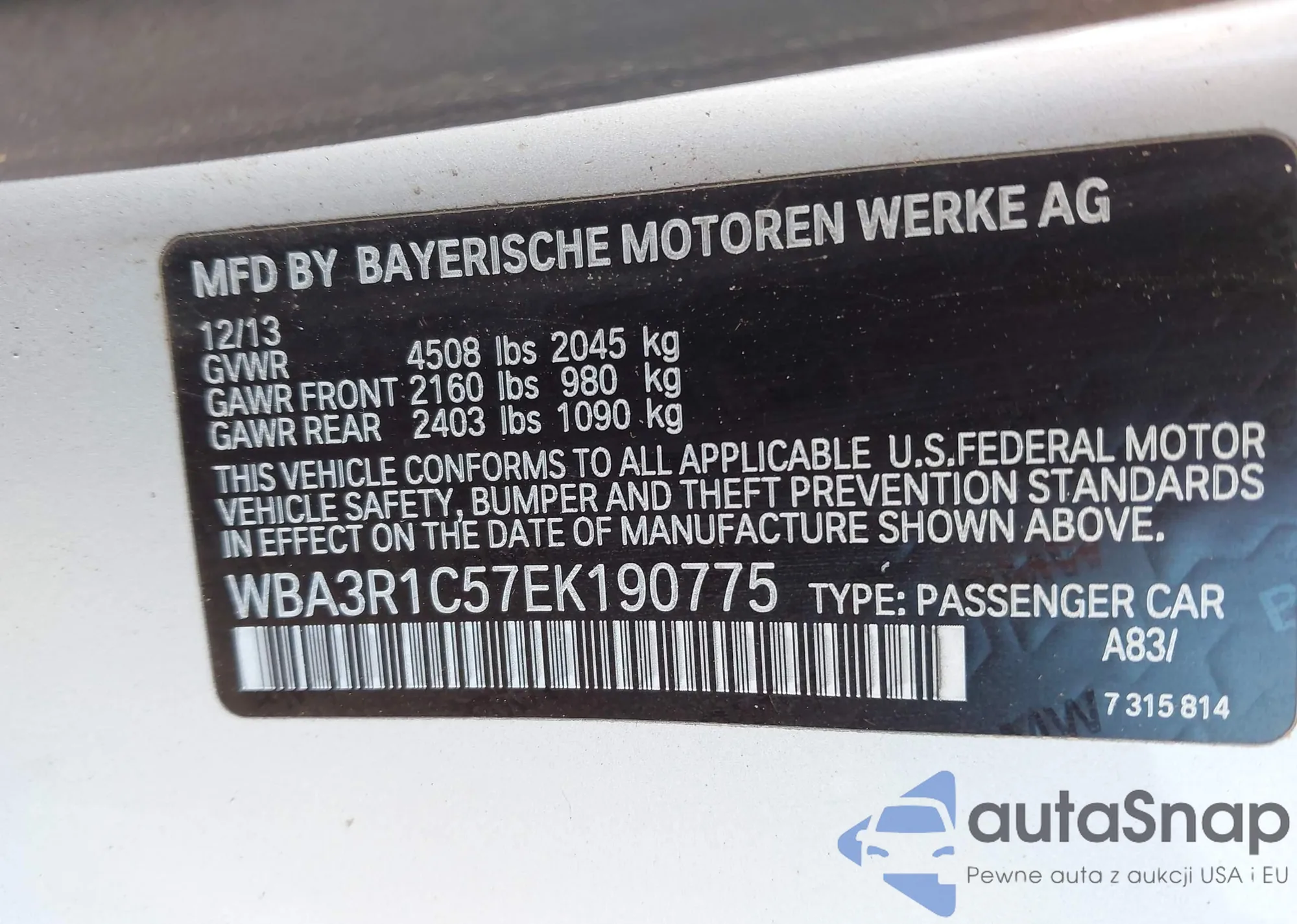 LOT: 43918229 VIN: WBA3R1C57EK190775