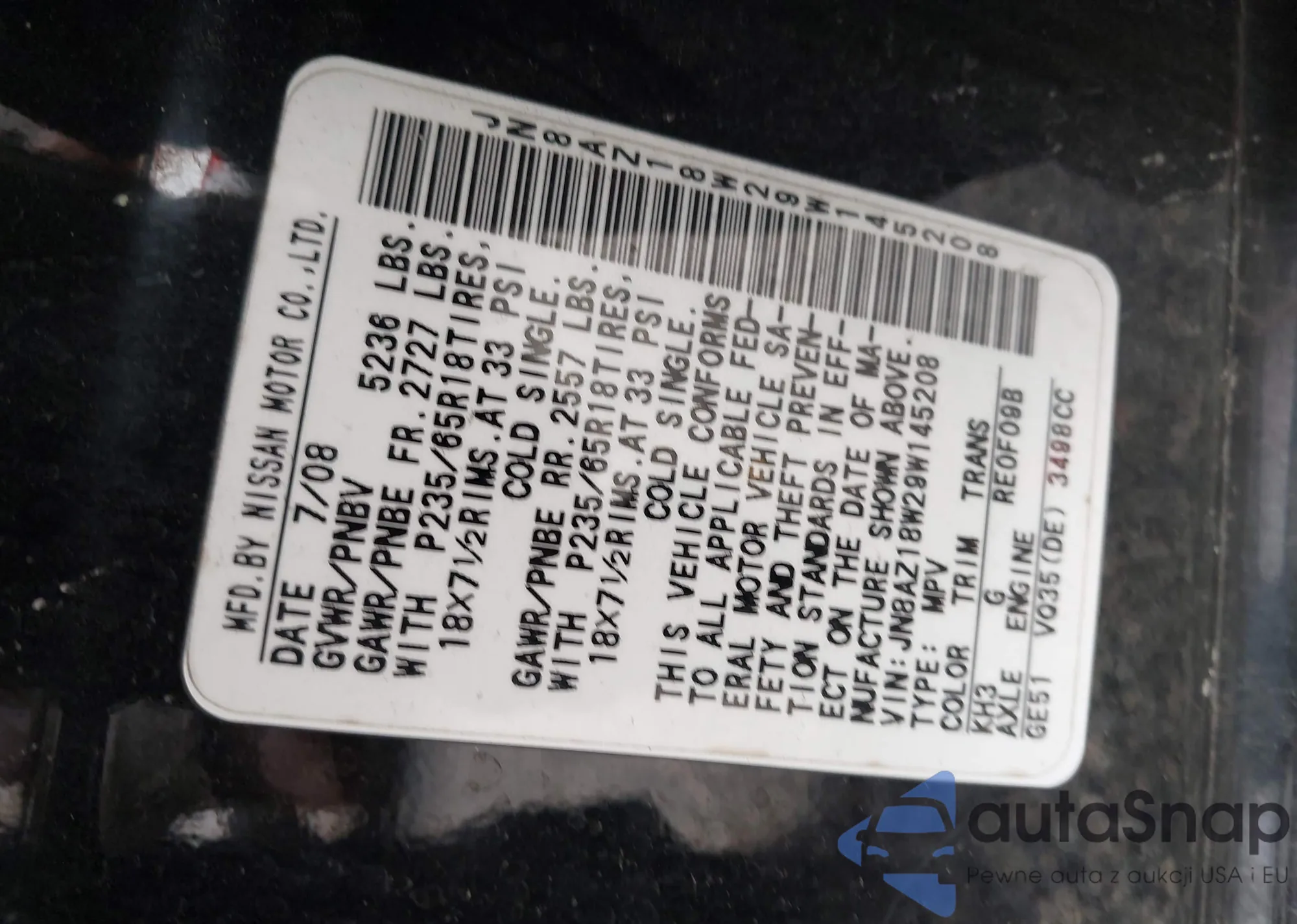 LOT: 43919792 VIN: JN8AZ18W29W145208