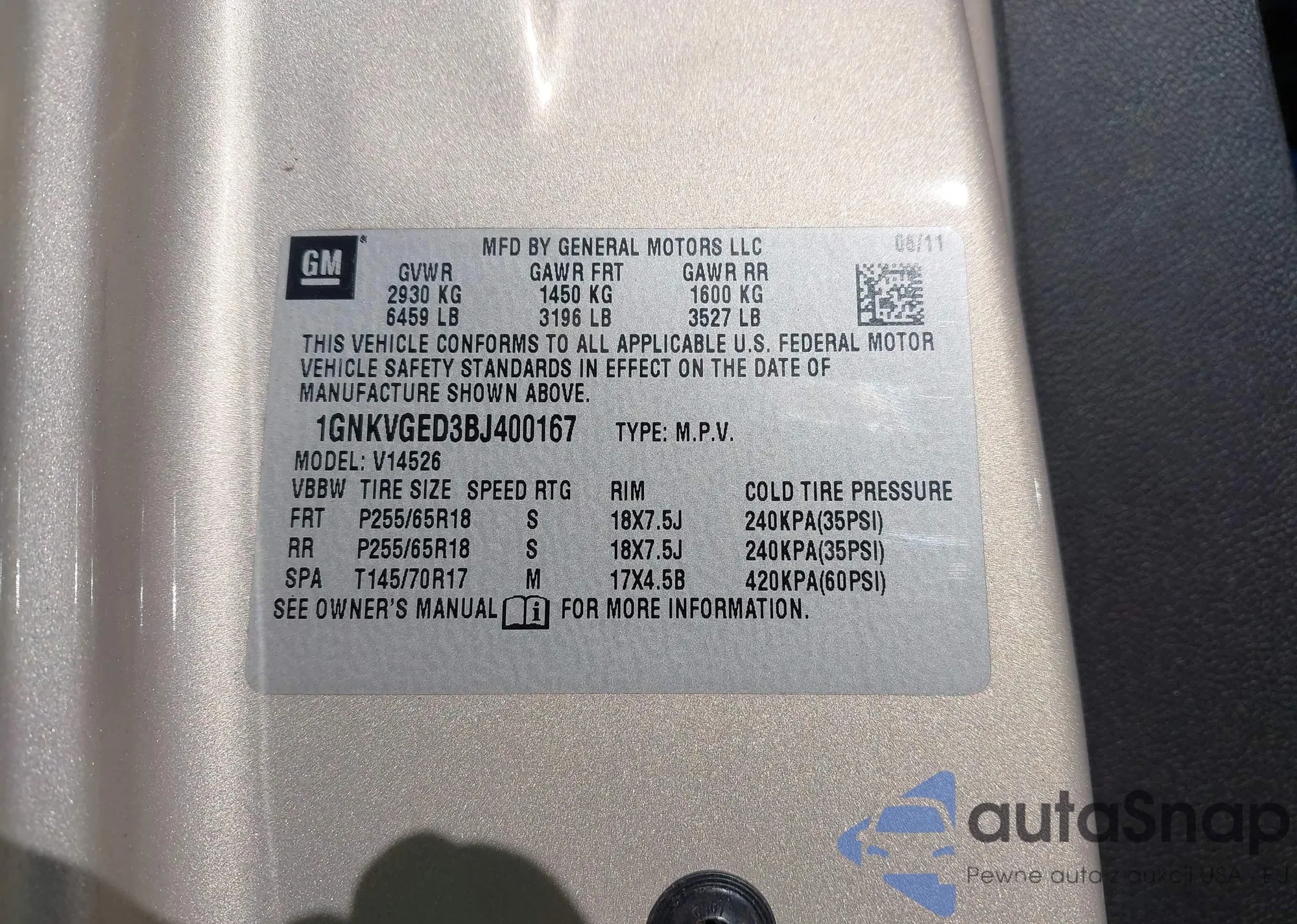LOT: 43035963 VIN: 5FNYF4H98BB003373