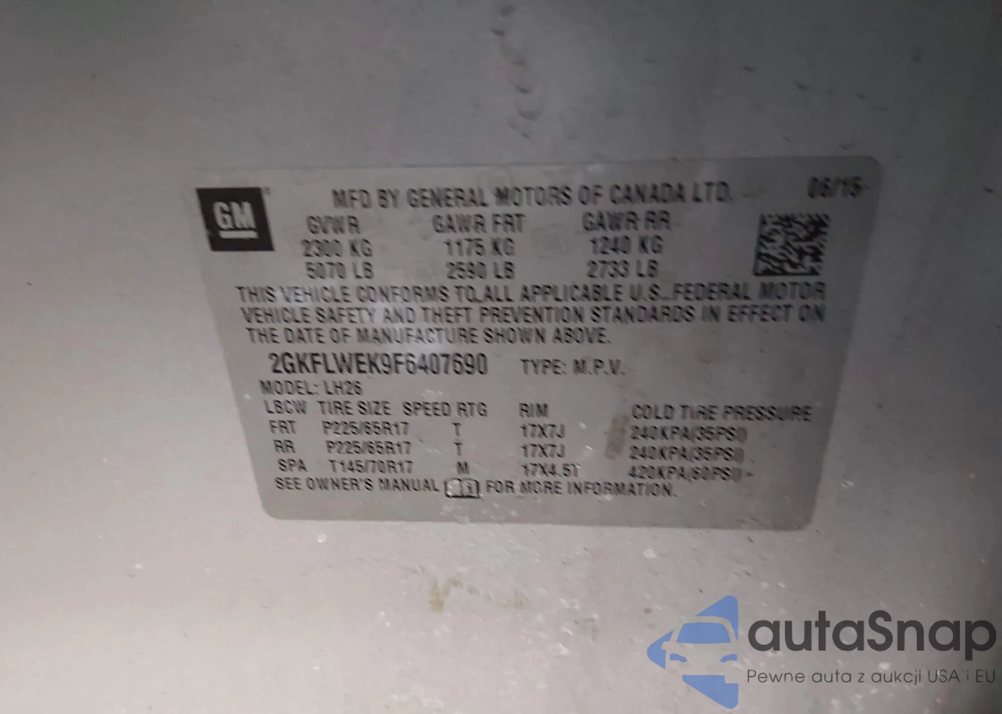 LOT: 43966720 VIN: 2G11Y5SL3E9196037