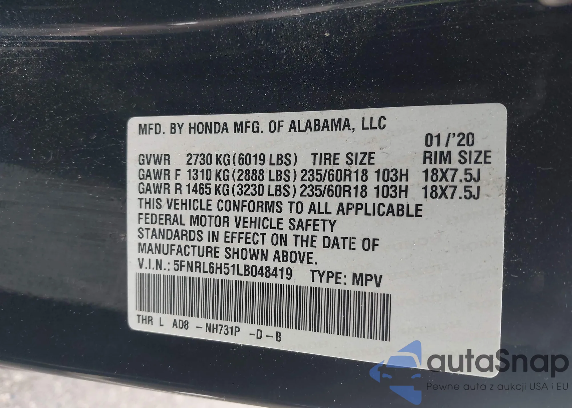 • VIN 5FNRL6H51LB048419