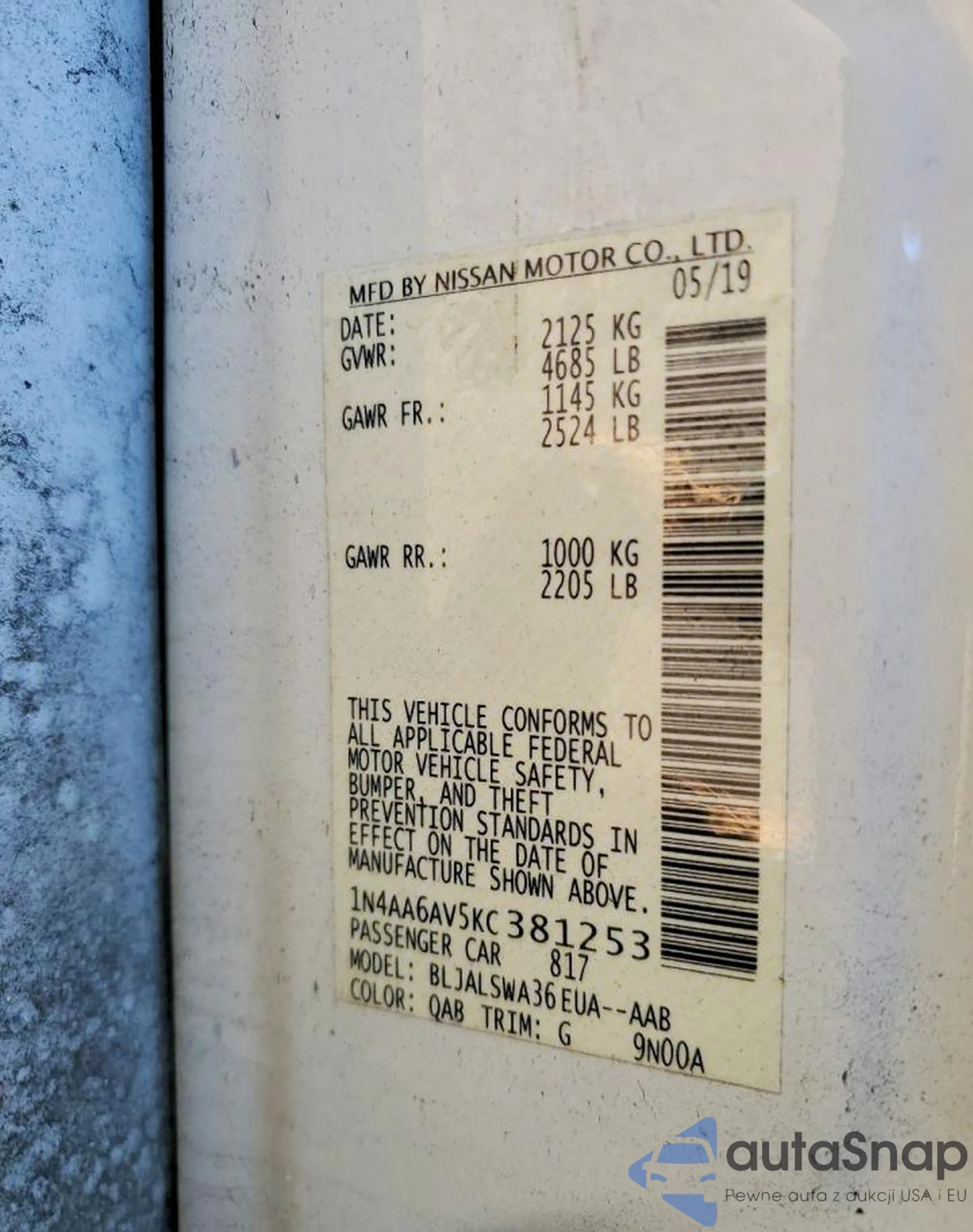 • VIN 1N4AA6AV5KC381253