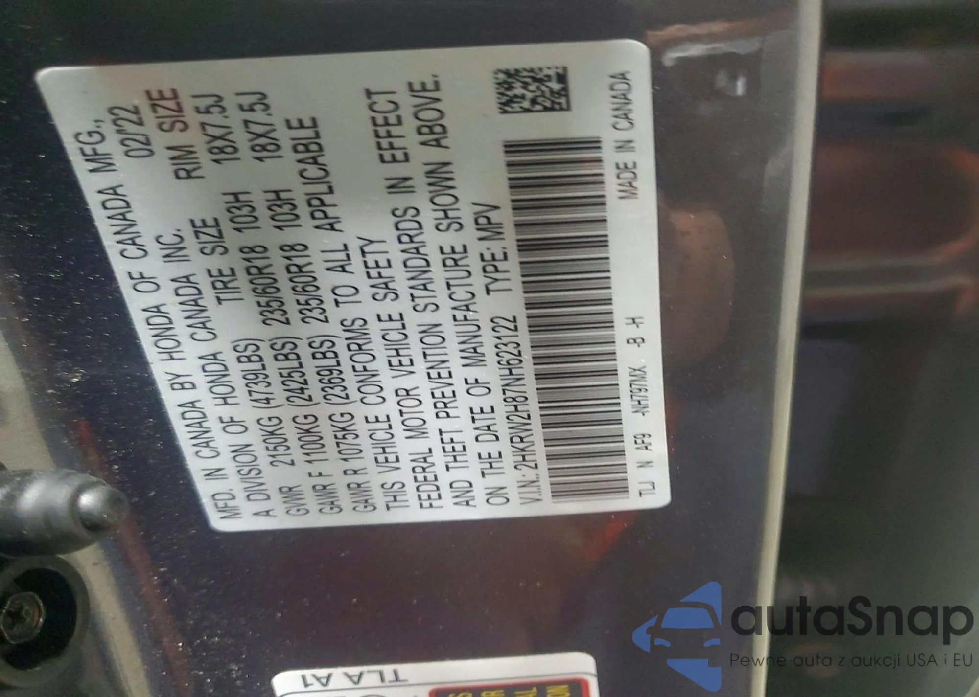 • VIN 2HKRW2H87NH623122