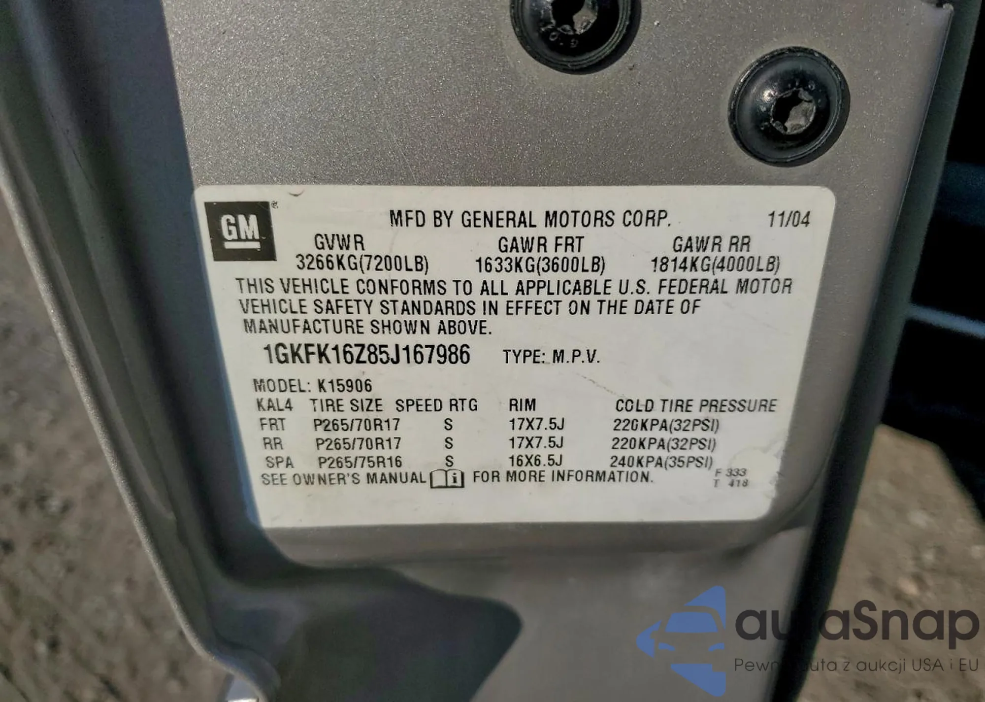 • VIN 1GKFK16Z85J167986