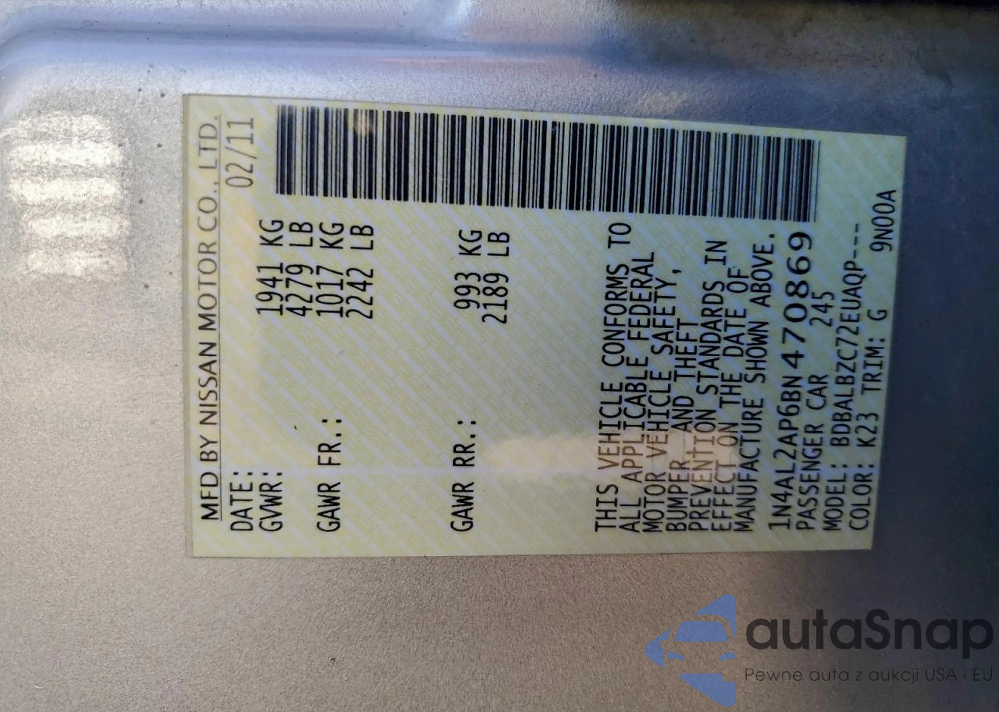 LOT: 99041555 VIN: 1N4AL2AP6BN470869