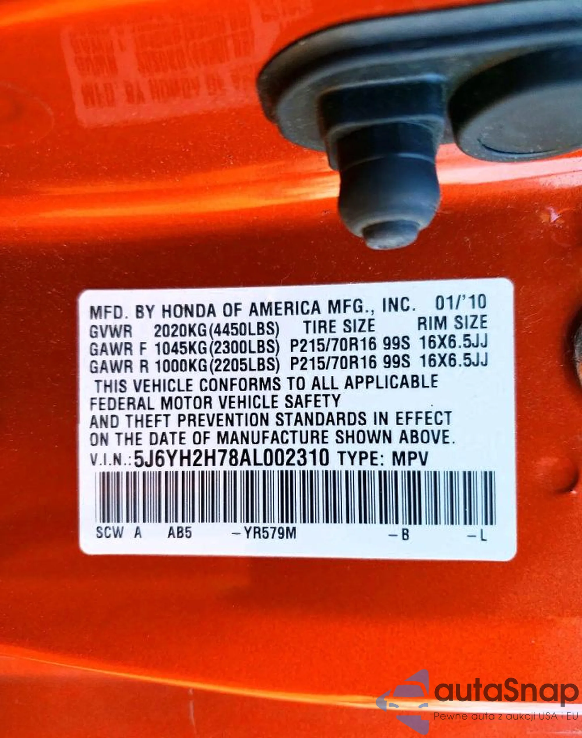 LOT: 72977125 VIN: 5J6YH2H78AL002310