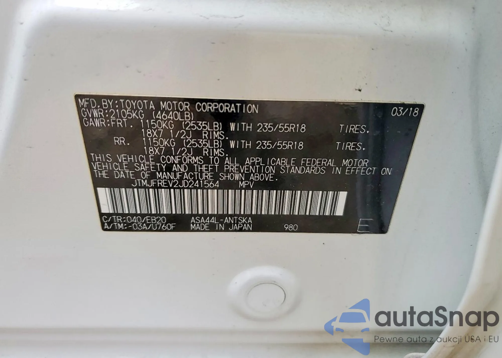 LOT: 99470705 VIN: JTMJFREV2JD241564