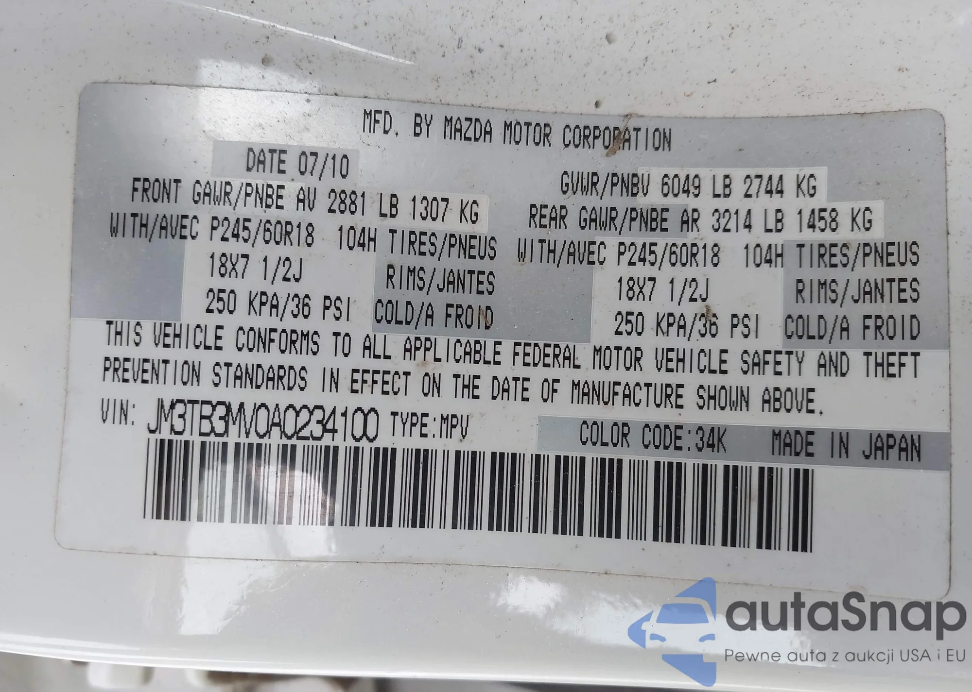 LOT: 43910269 VIN: JM3TB3MV0A0234100