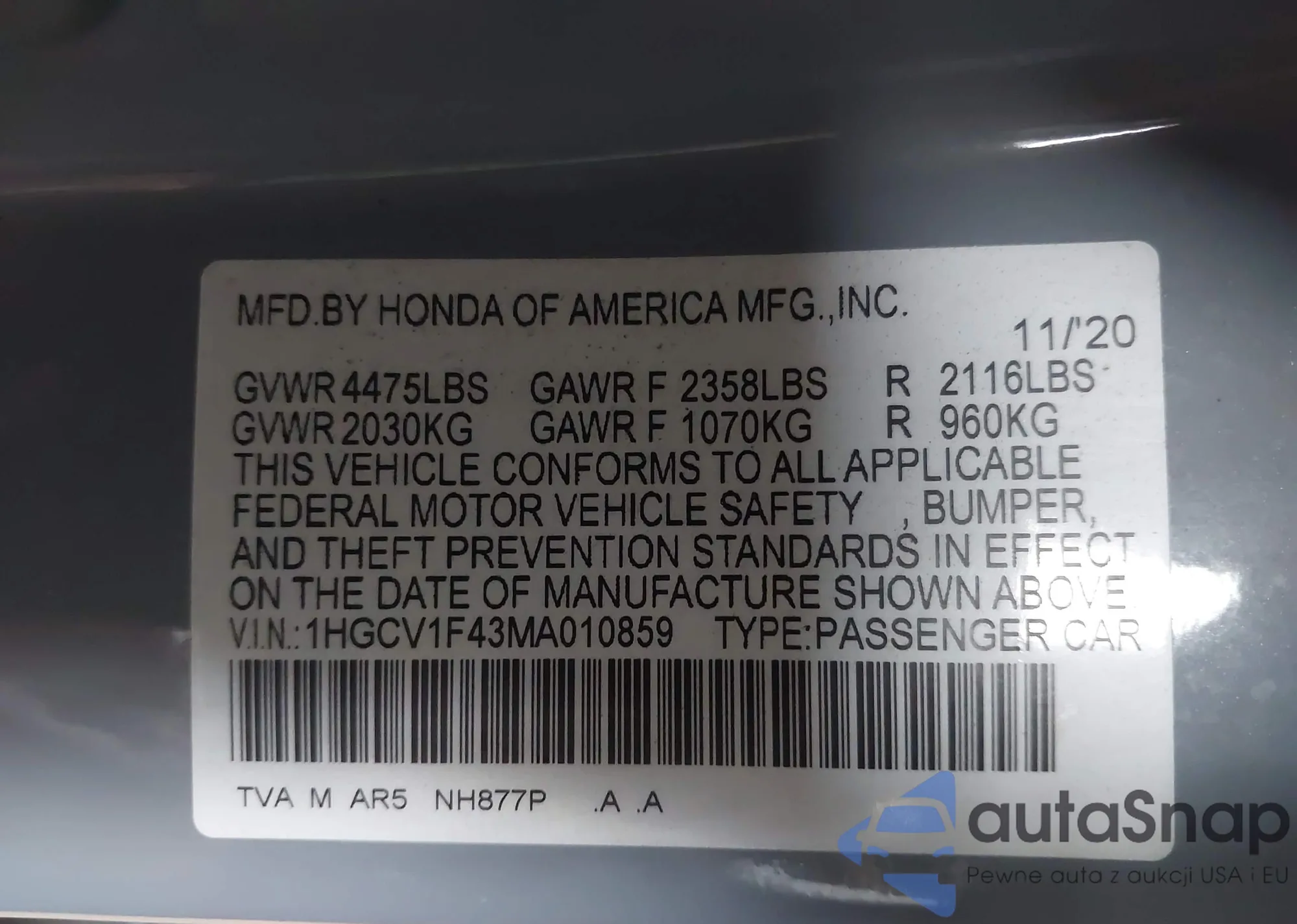 LOT: 43750424 VIN: 1HGCV1F43MA010859