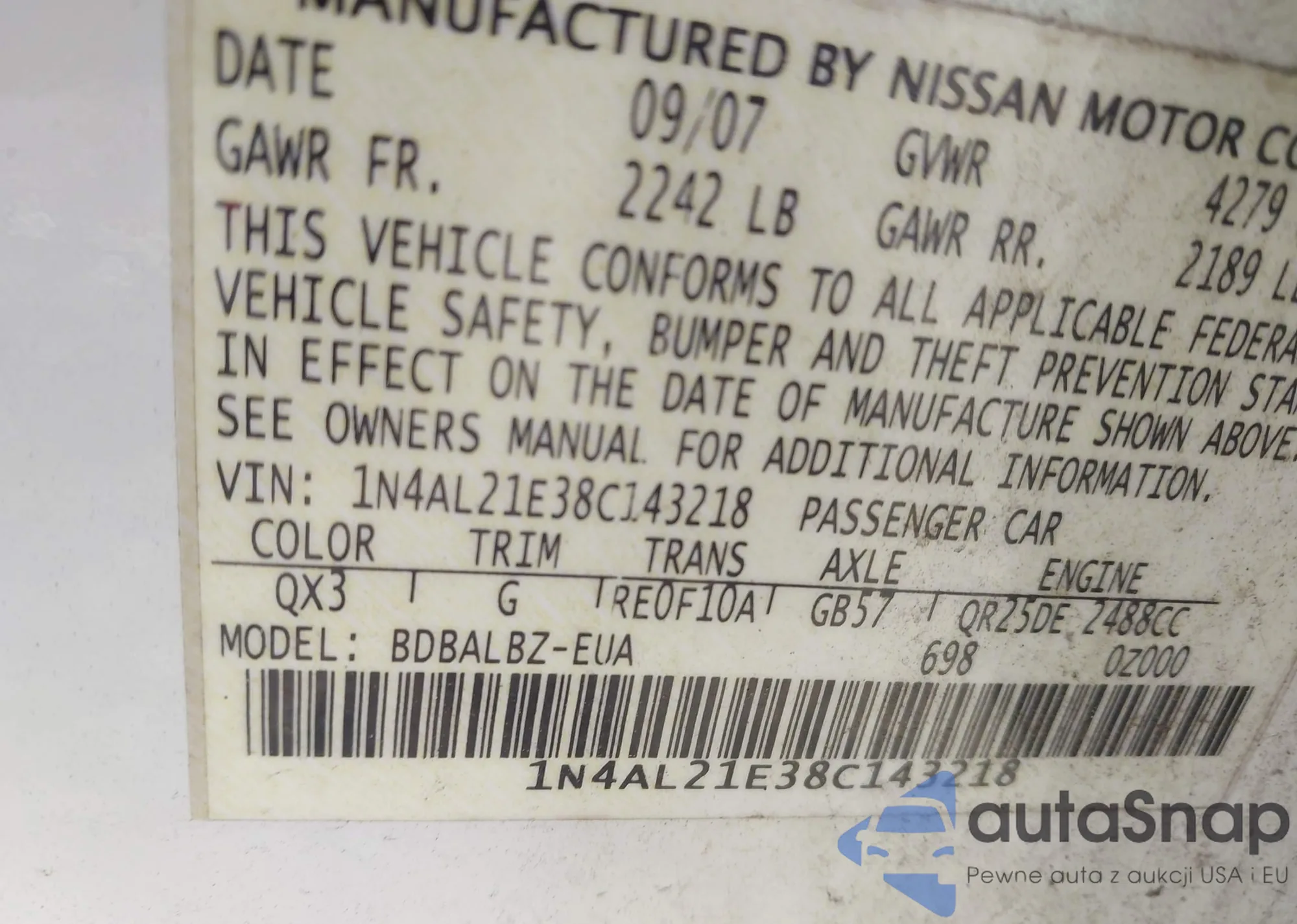 LOT: 43908139 VIN: 1N4AL21E38C143218