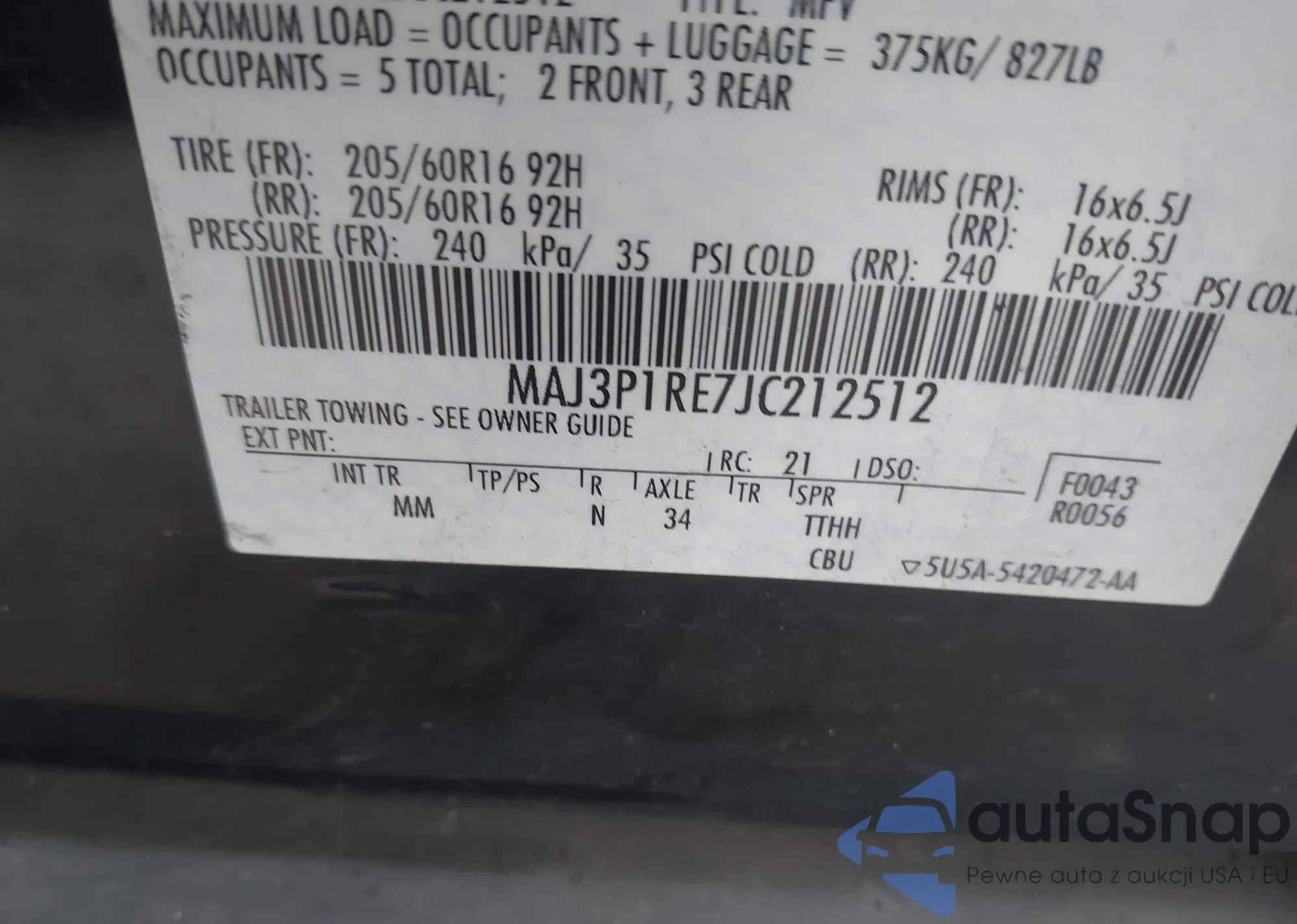 LOT: 43812357 VIN: MAJ3P1RE7JC212512