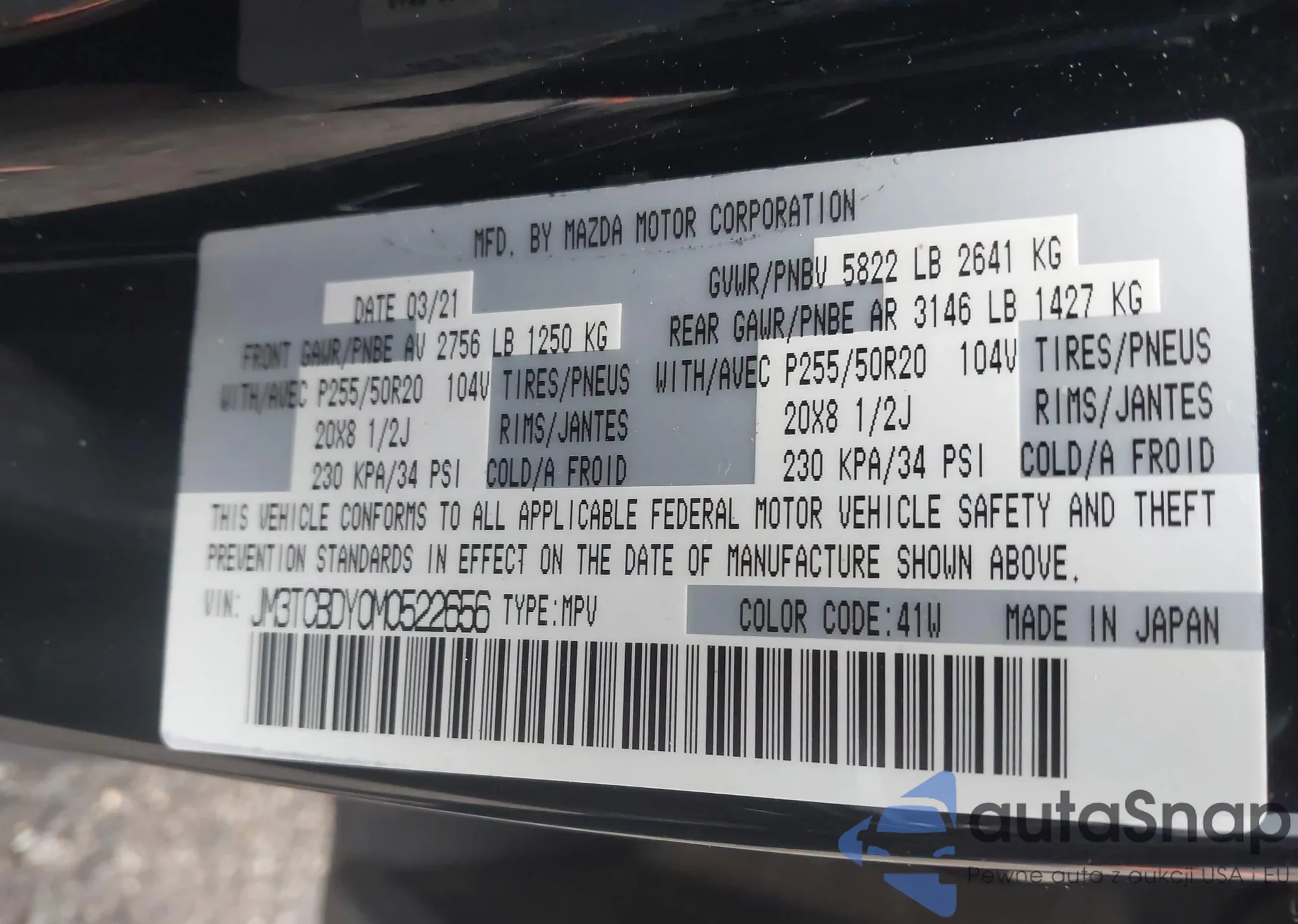 LOT: 43857537 VIN: JM3TCBDY0M0522656