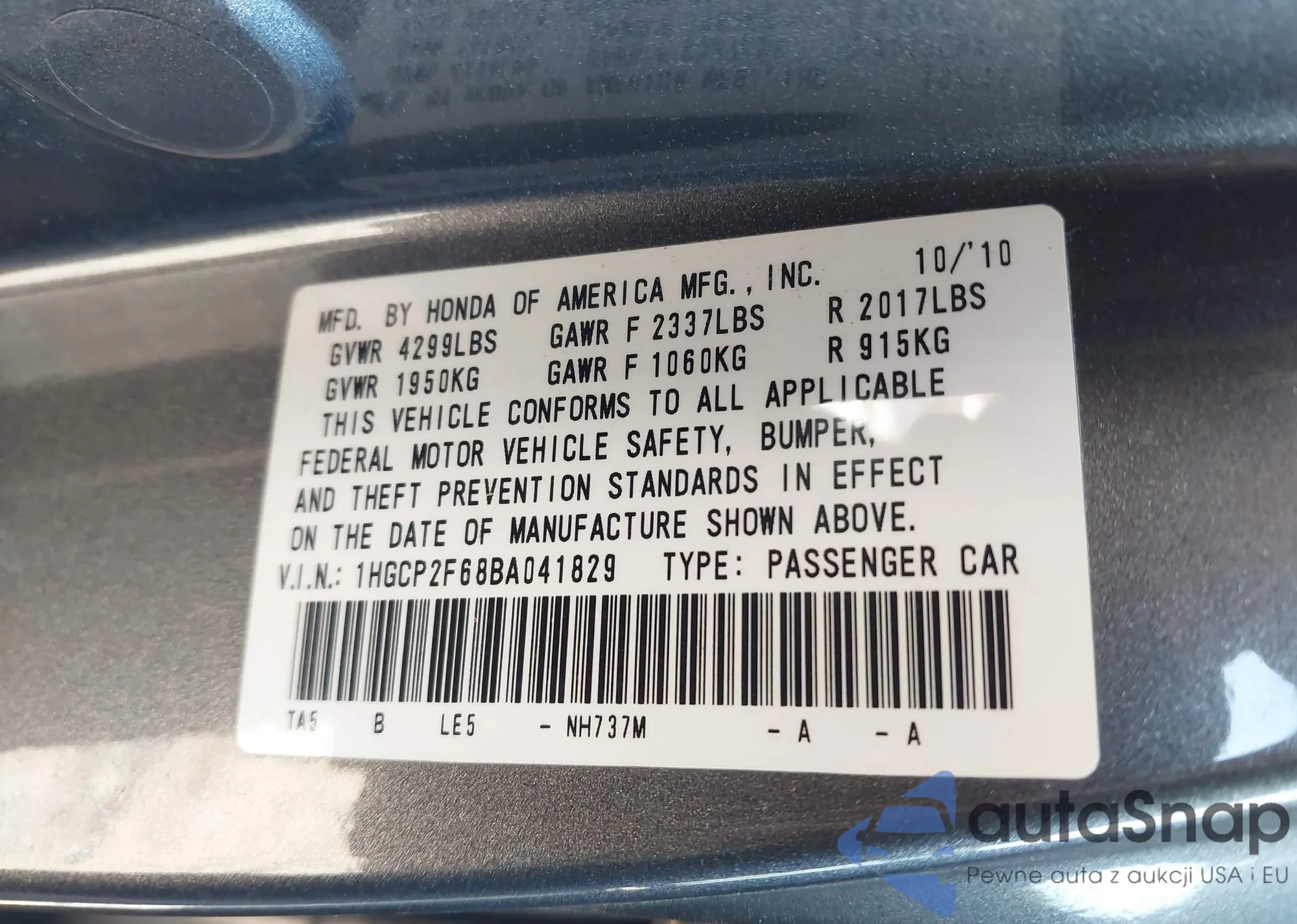 LOT: 44012840 VIN: 1HGCP2F68BA041829