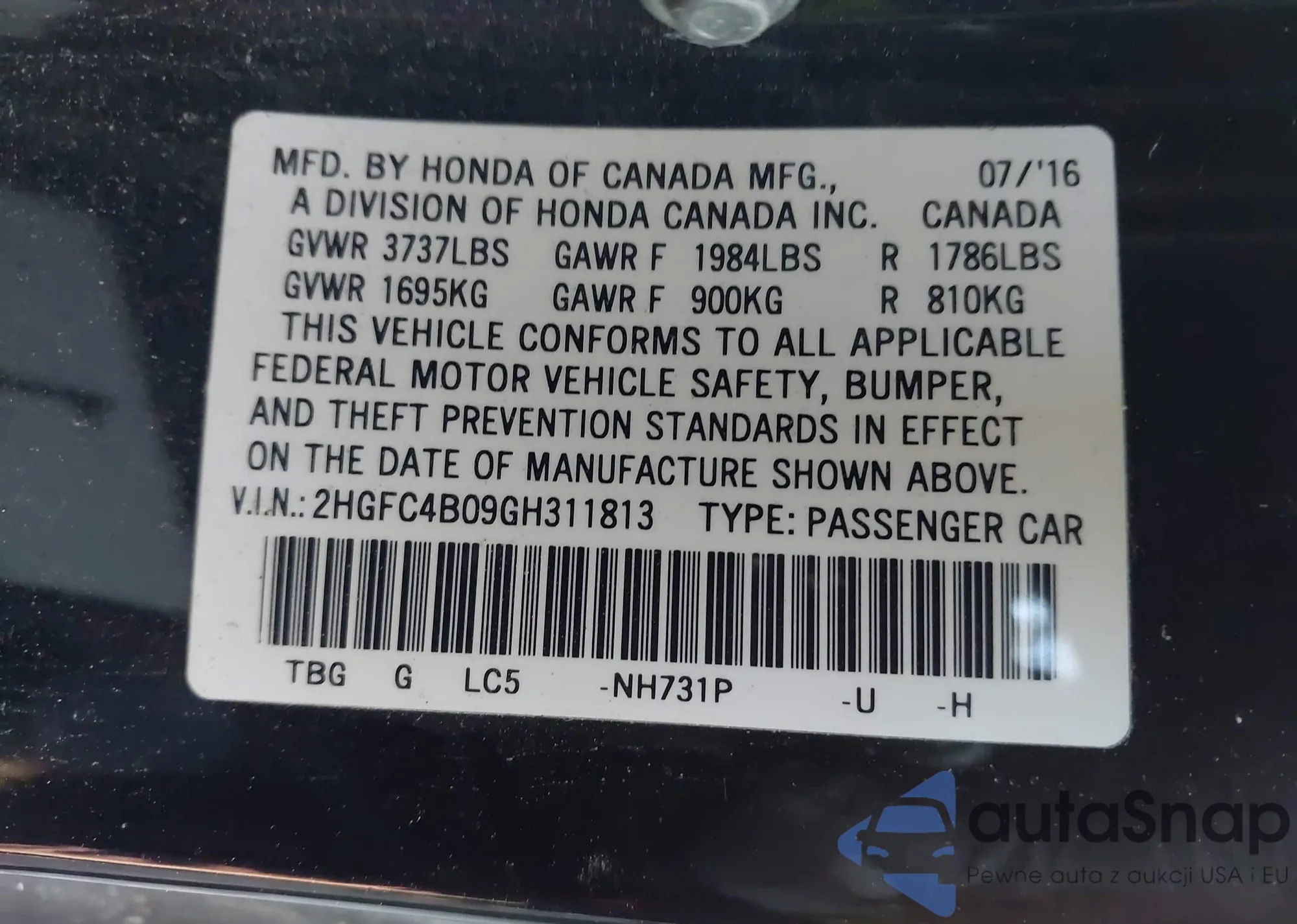 LOT: 44064202 VIN: 2HGFC4B09GH311813