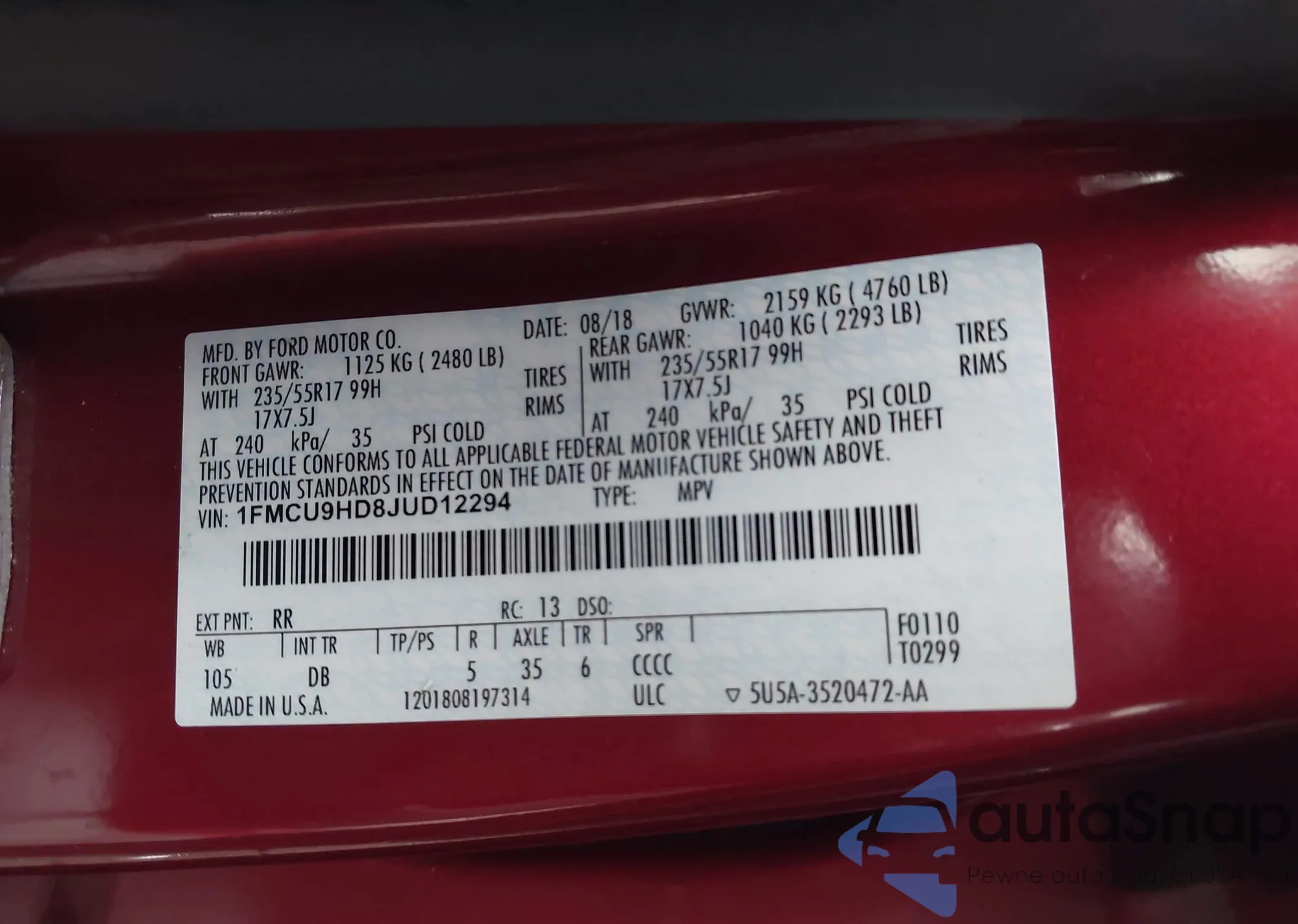 • VIN 1FMCU9HD8JUD12294