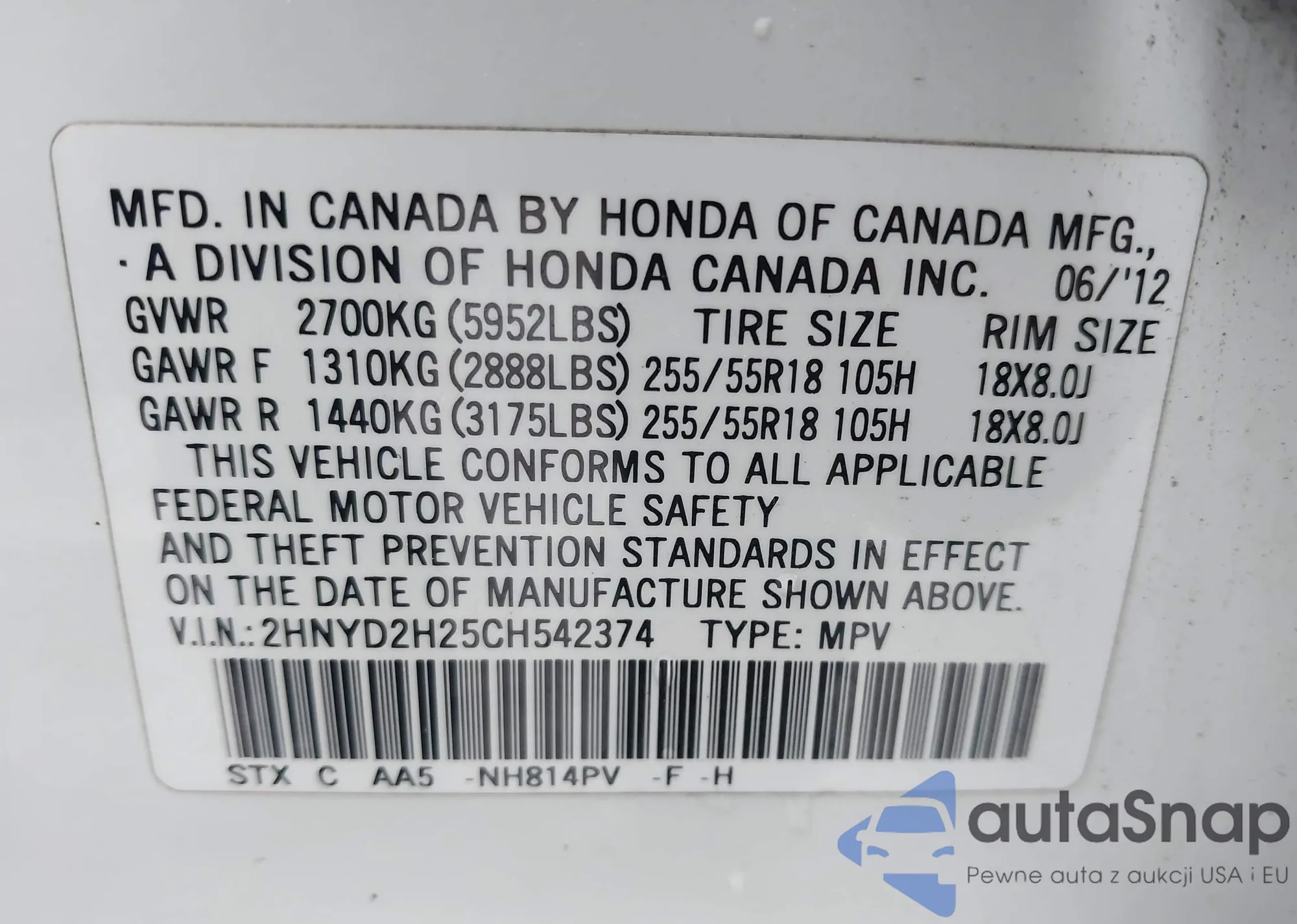 • VIN 2HNYD2H25CH542374