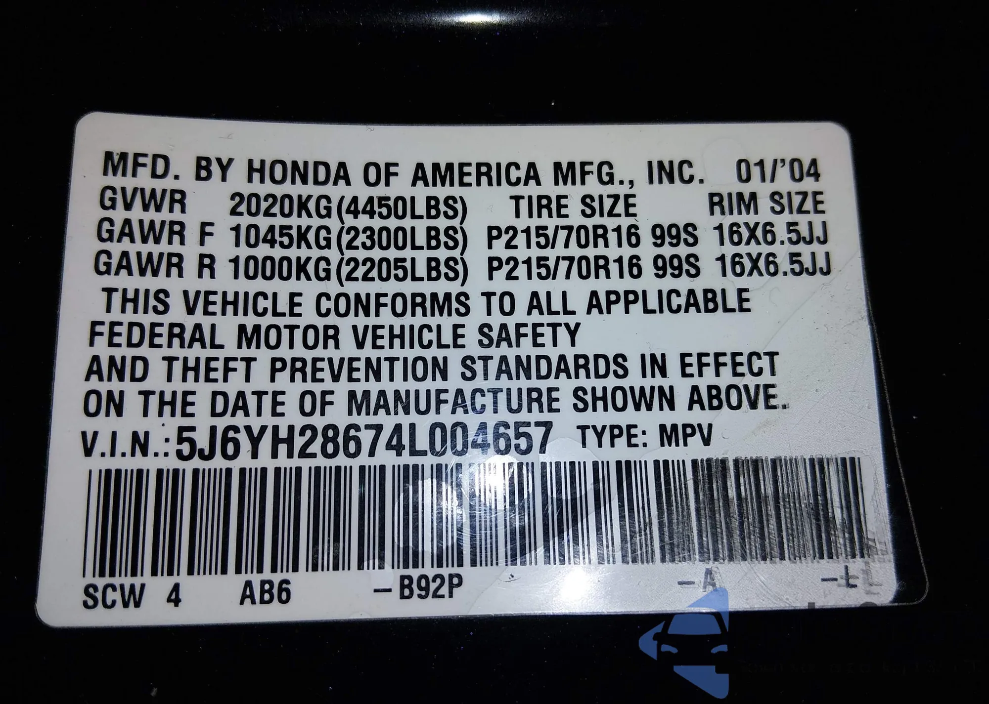• VIN 5J6YH28674L004657