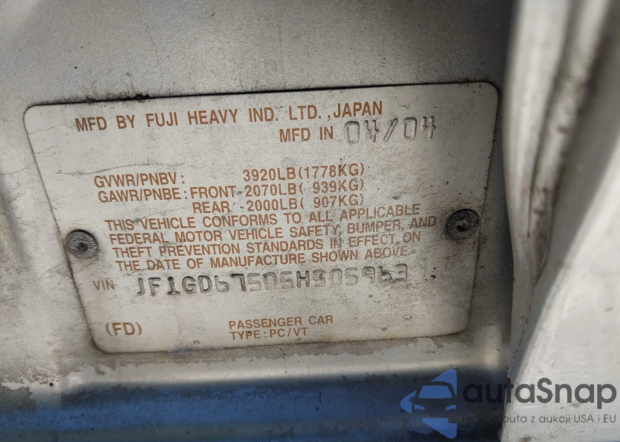 LOT: 44200305 VIN: JF1GD67505H505963