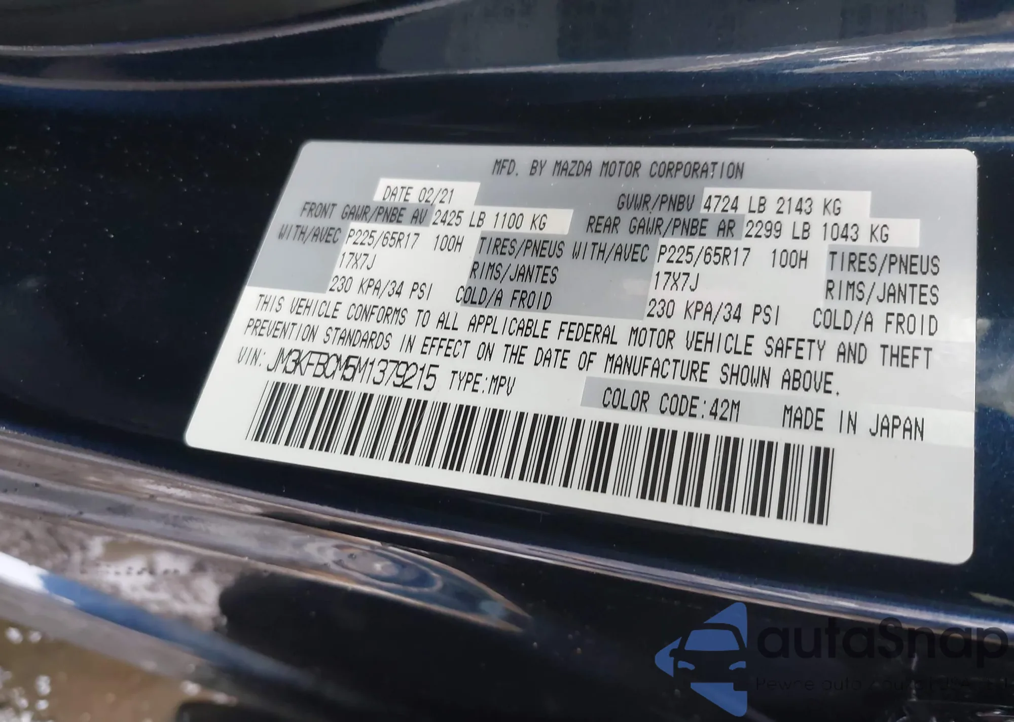 LOT: 43935640 VIN: JM3KFBCM5M1379215