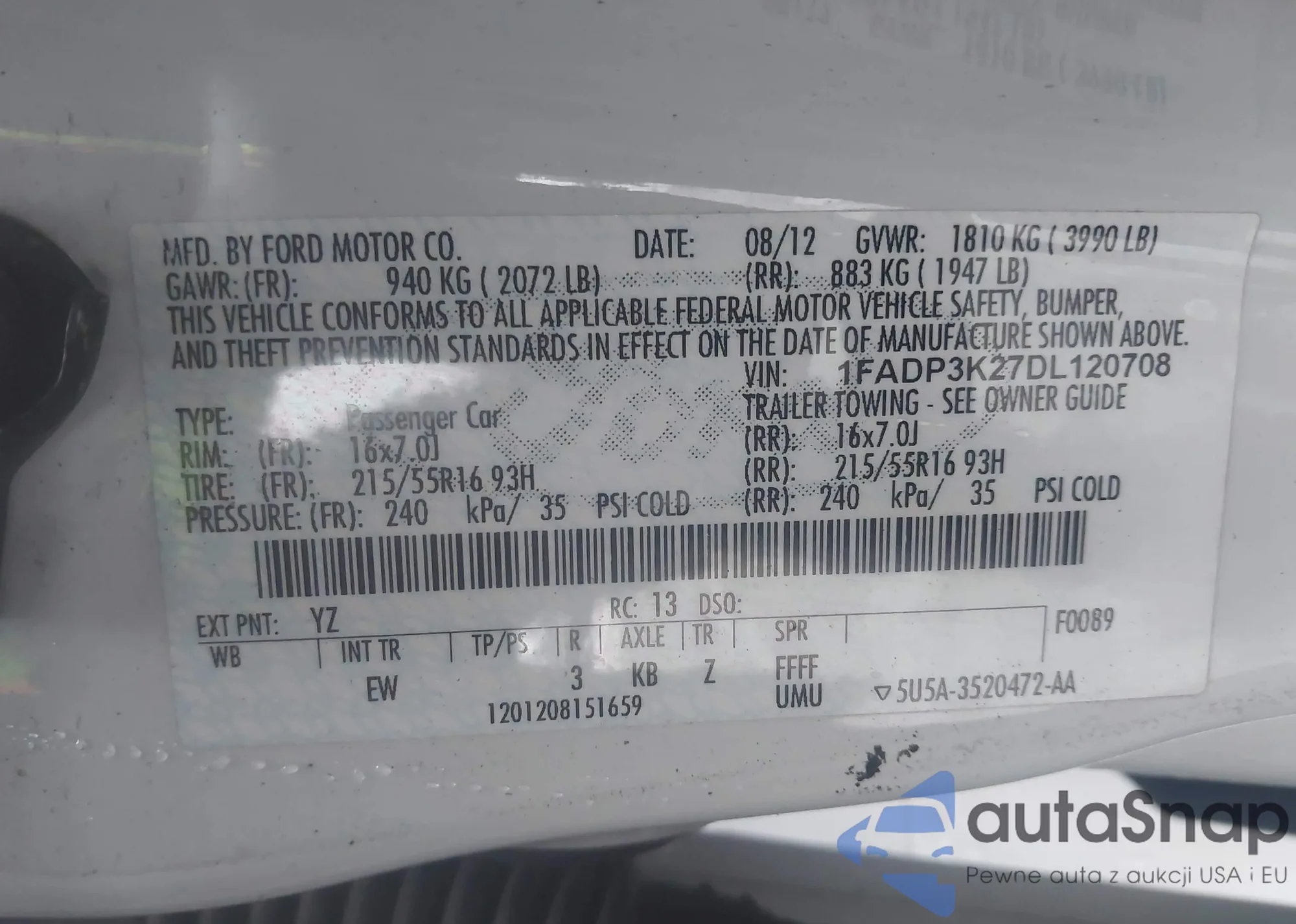 • VIN 1FADP3K27DL120708