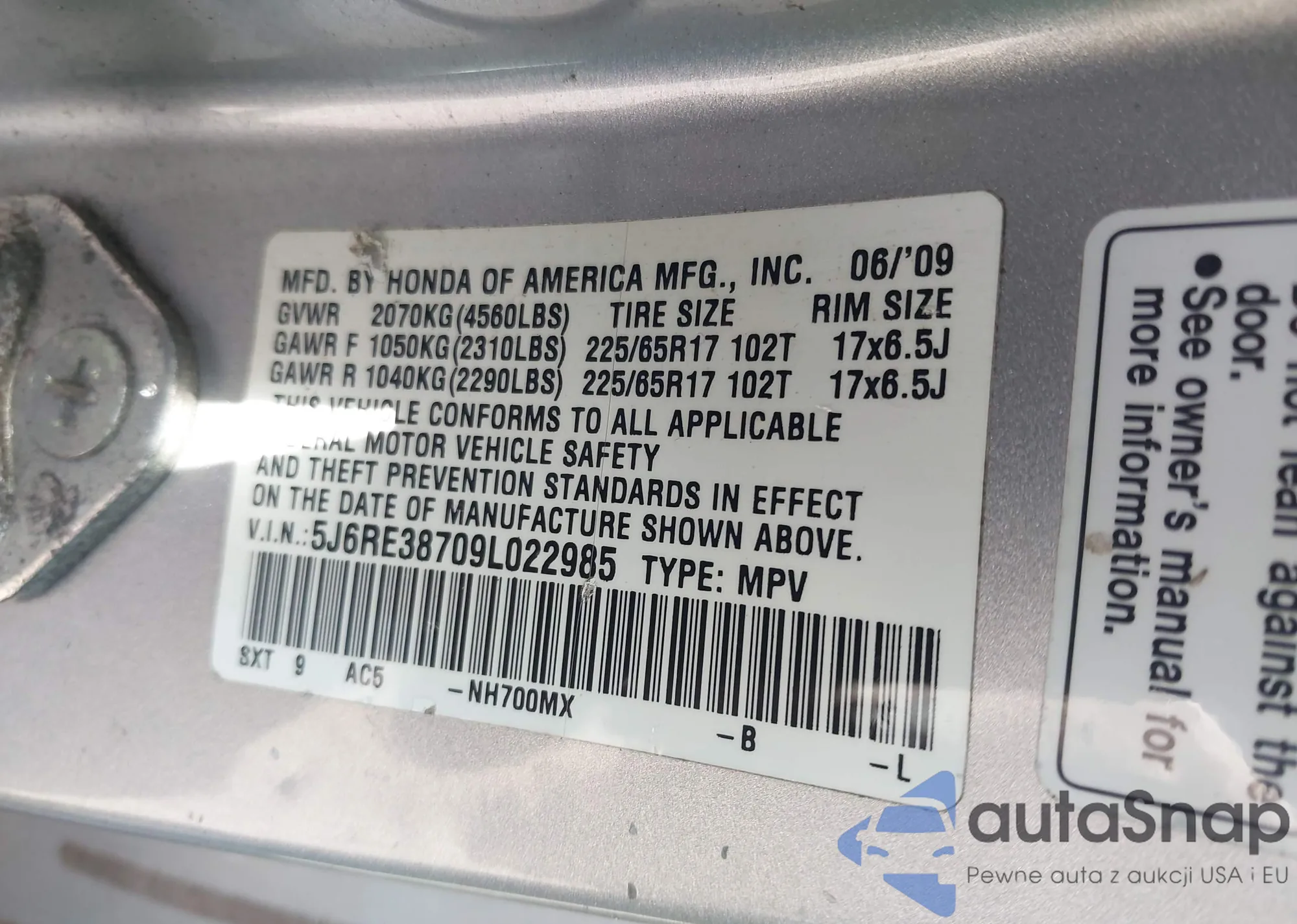 LOT: 44086086 VIN: 5J6RE38709L022985