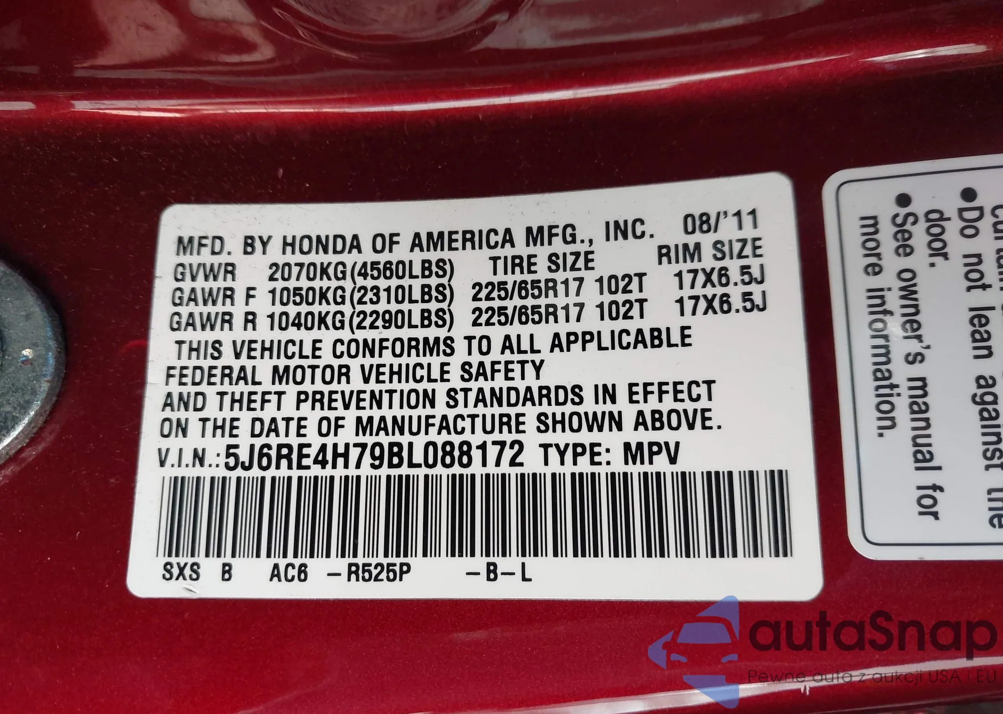 • VIN 5J6RE4H79BL088172