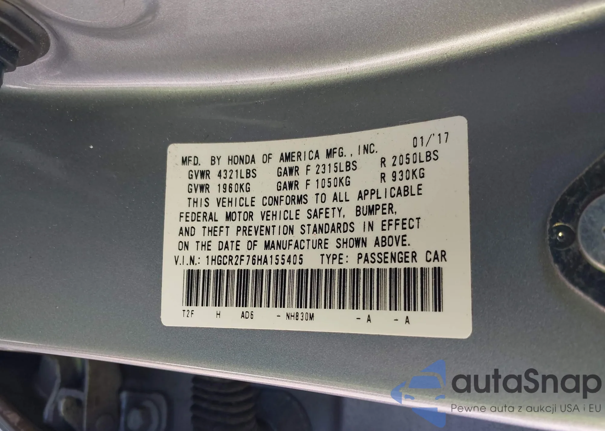 LOT: 43777903 VIN: 1HGCR2F76HA155405