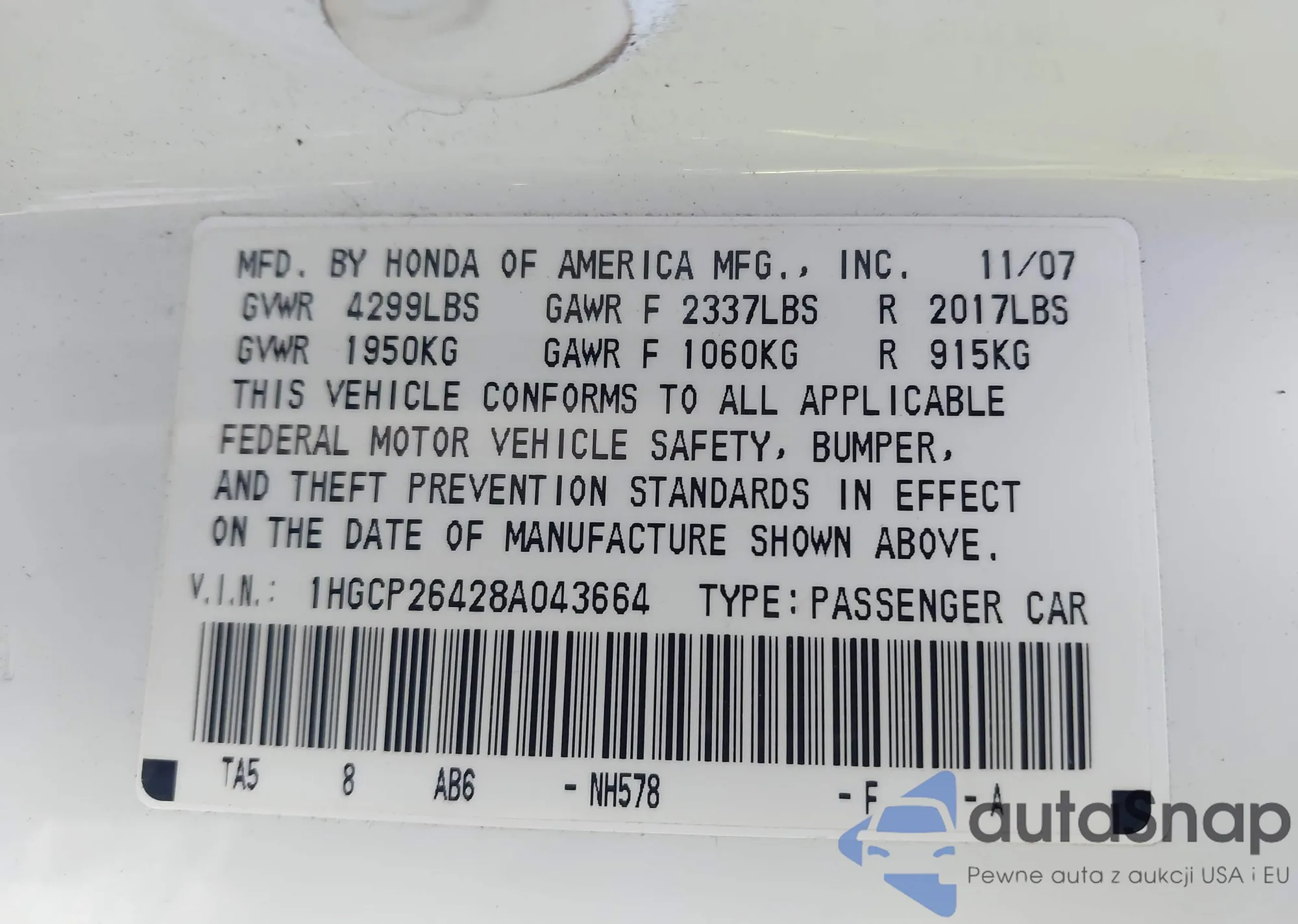 LOT: 44046680 VIN: 1HGCP26428A043664