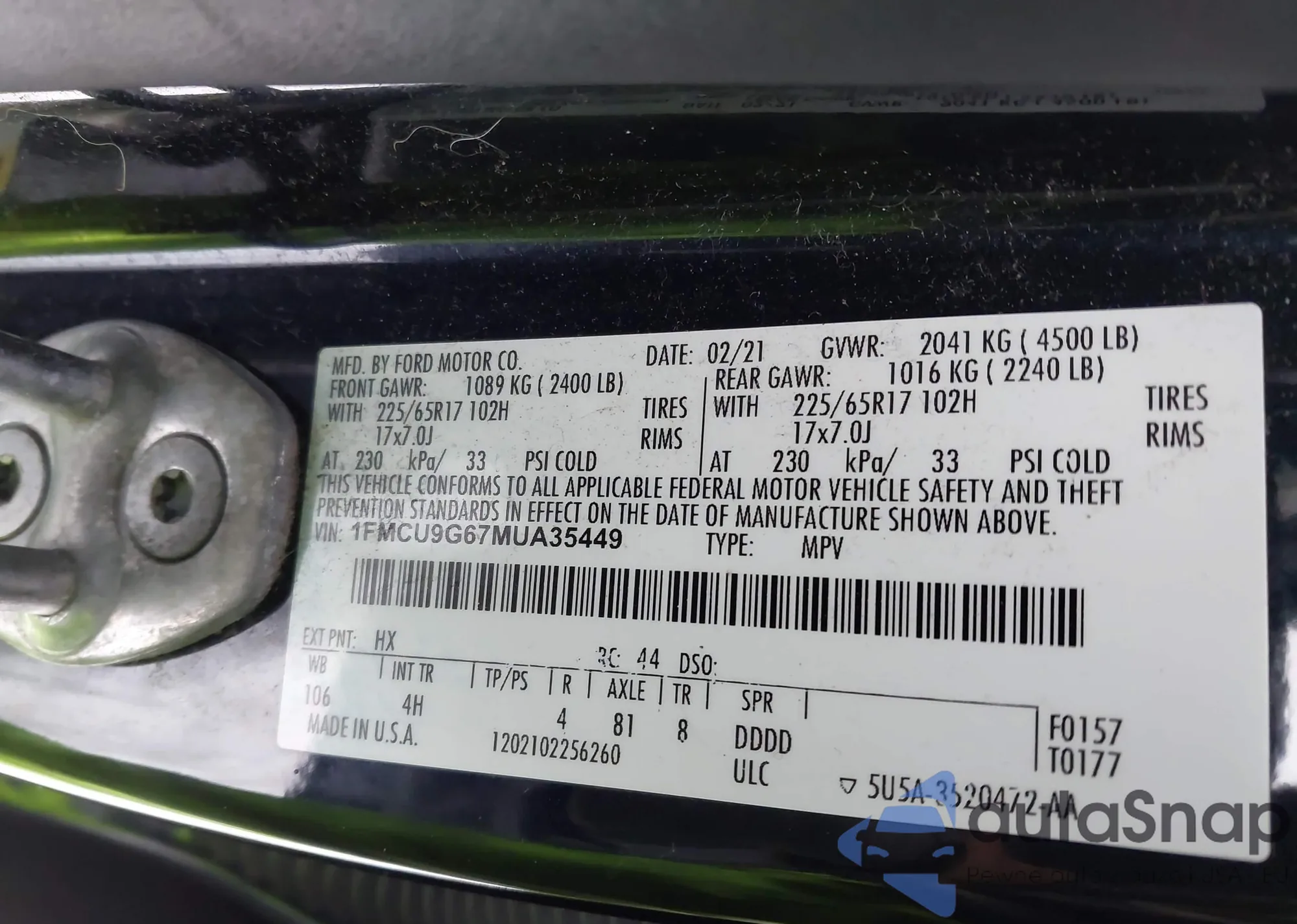 • VIN 1FMCU9G67MUA35449