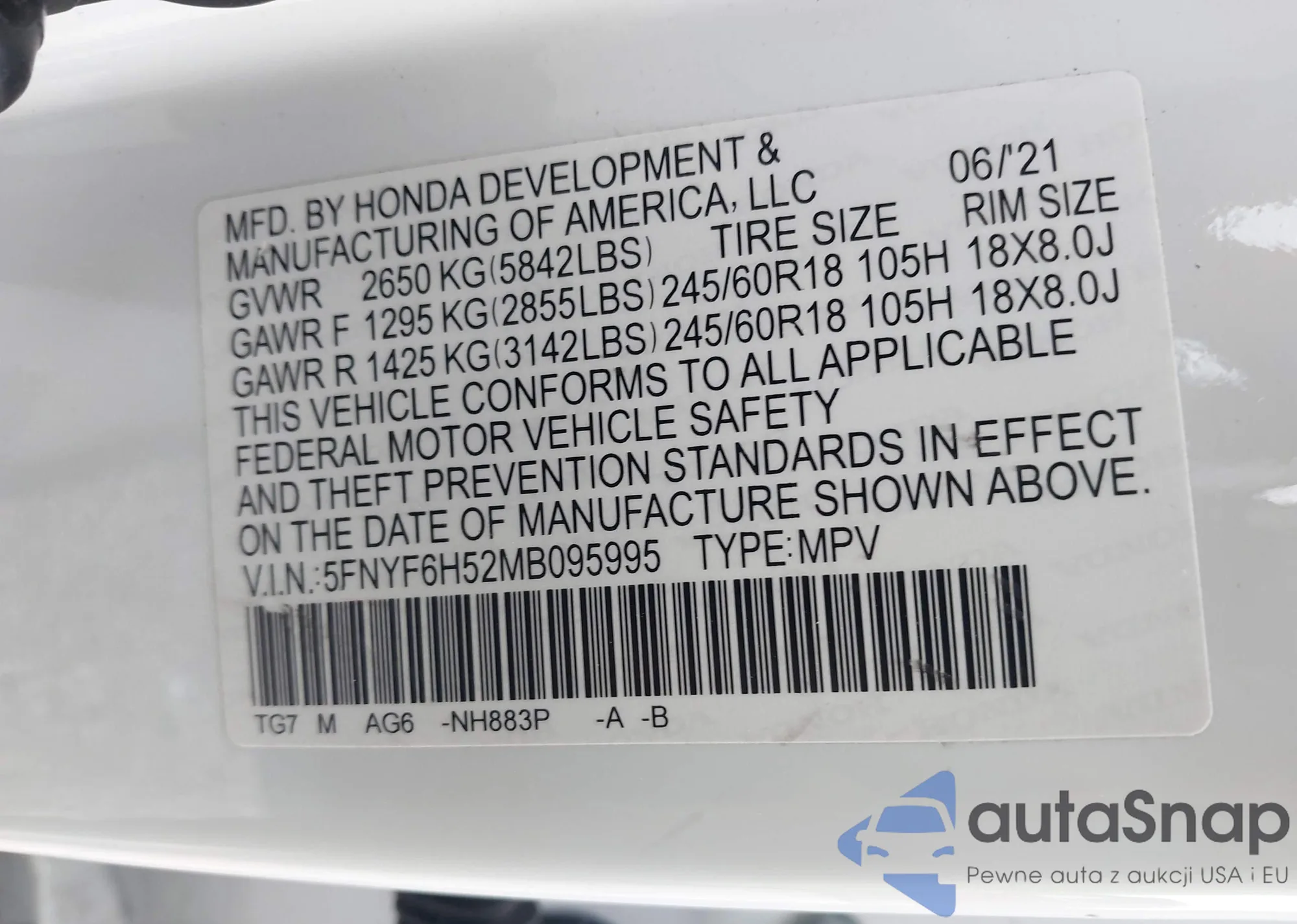 LOT: 43495001 VIN: 5FNYF6H52MB095995