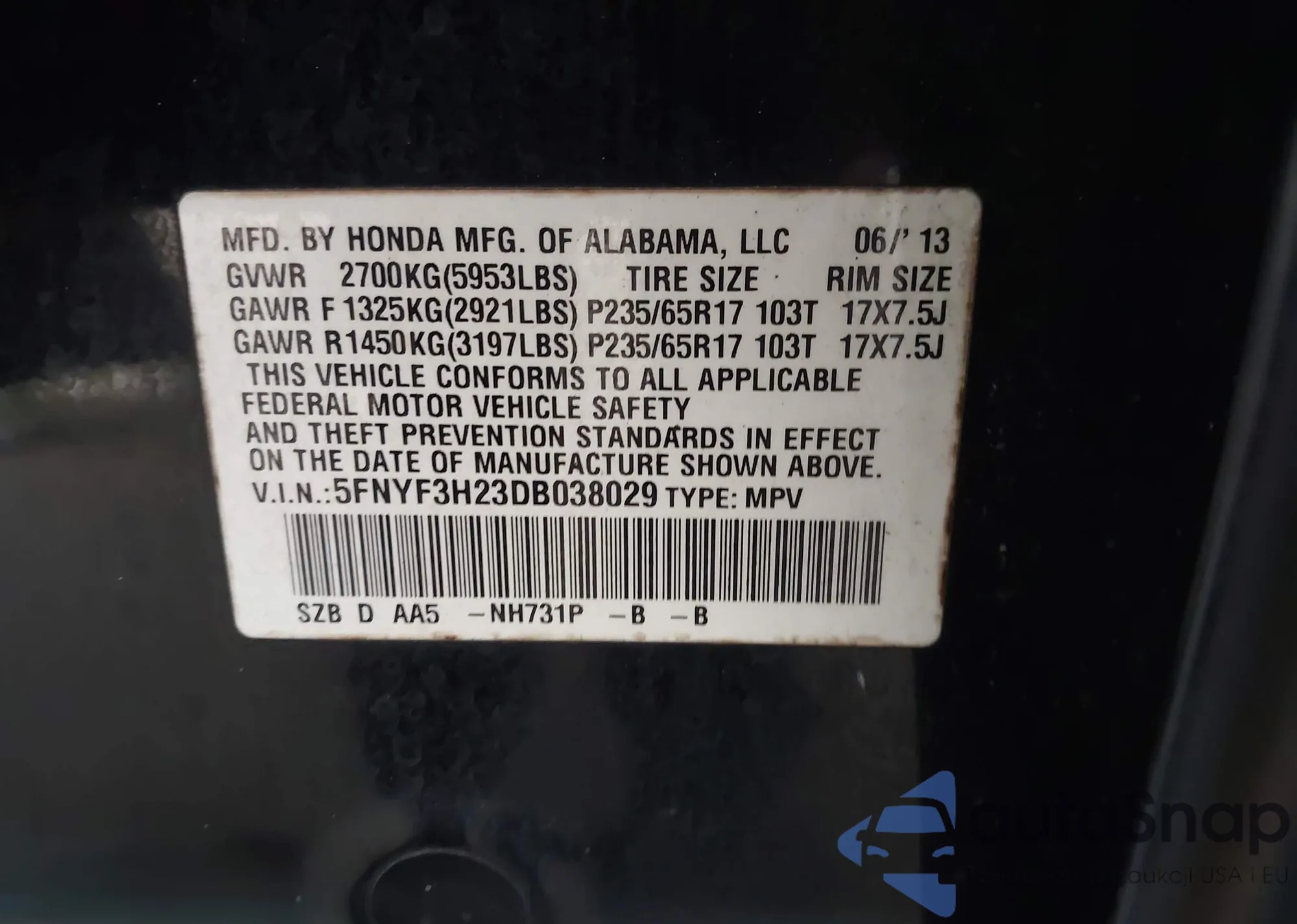 • VIN 5FNYF3H23DB038029