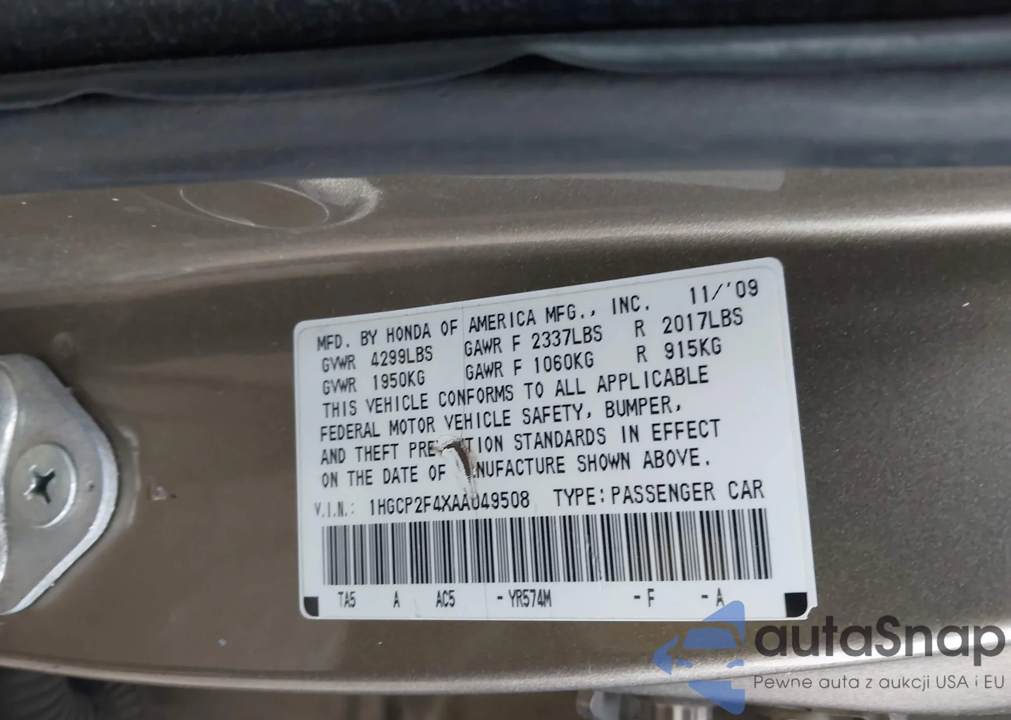 LOT: 43976043 VIN: 1HGCP2F4XAA049508
