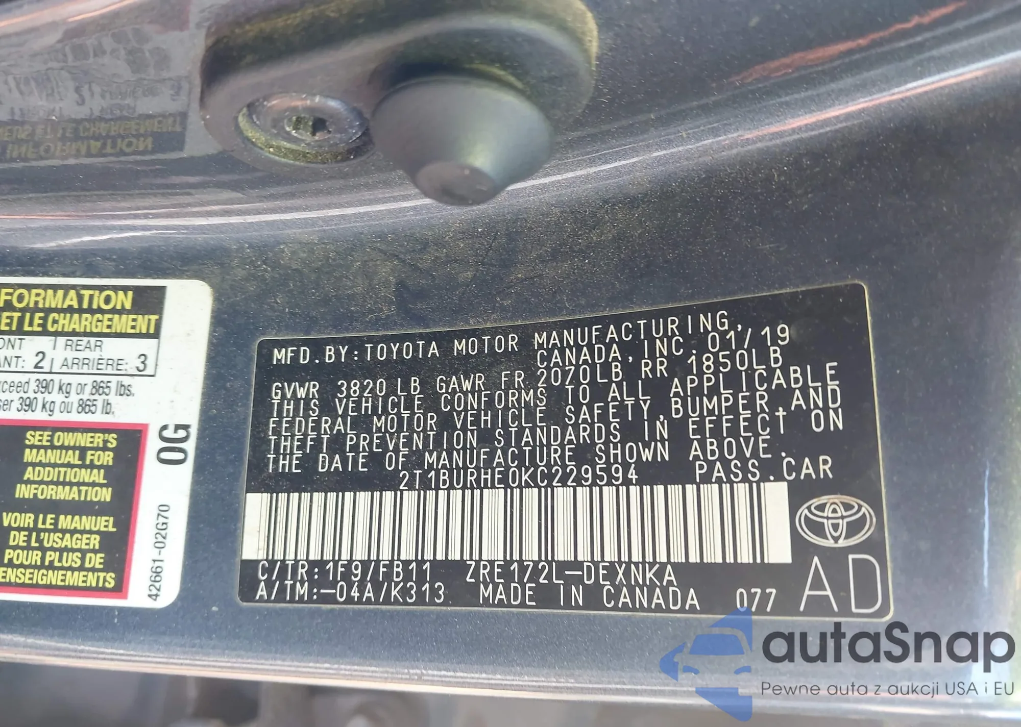LOT: 43994070 VIN: 2T1BURHE0KC229594