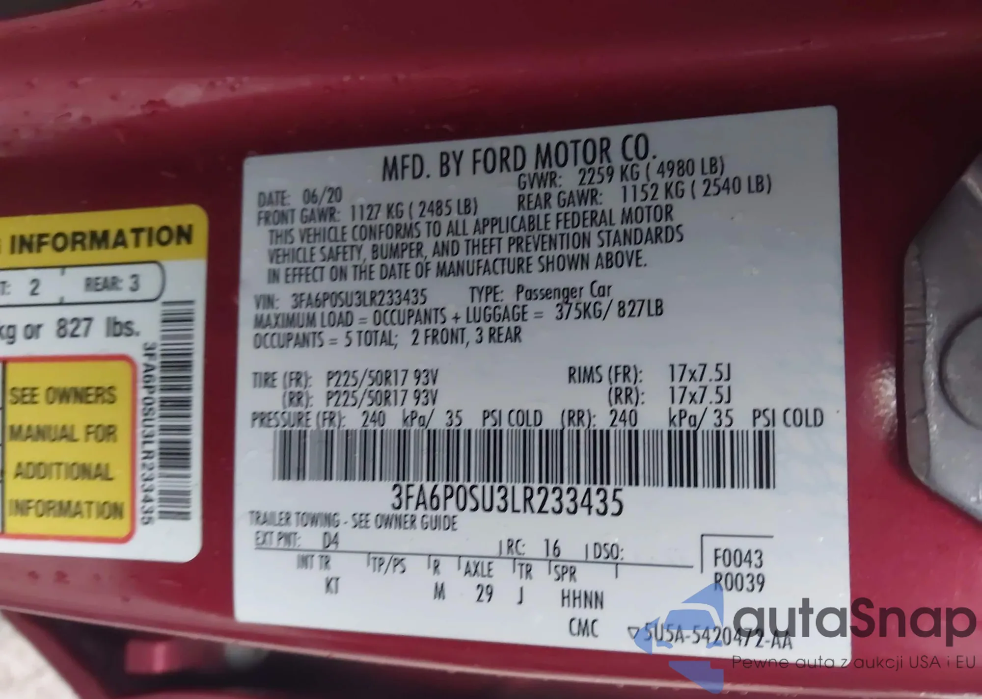 LOT: 44018434 VIN: 3FA6P0SU3LR233435