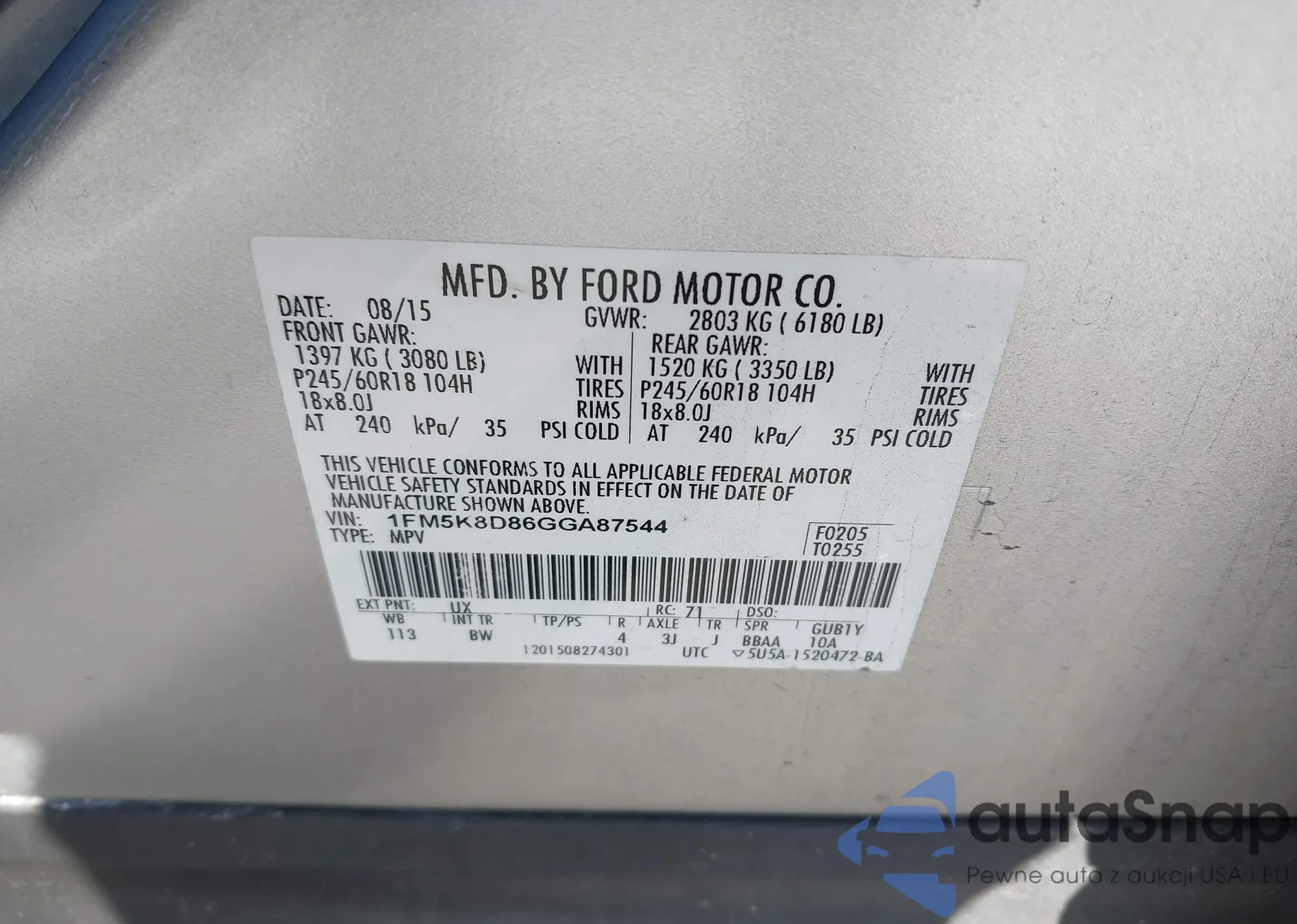 LOT: 44185501 VIN: 1FM5K8D86GGA87544