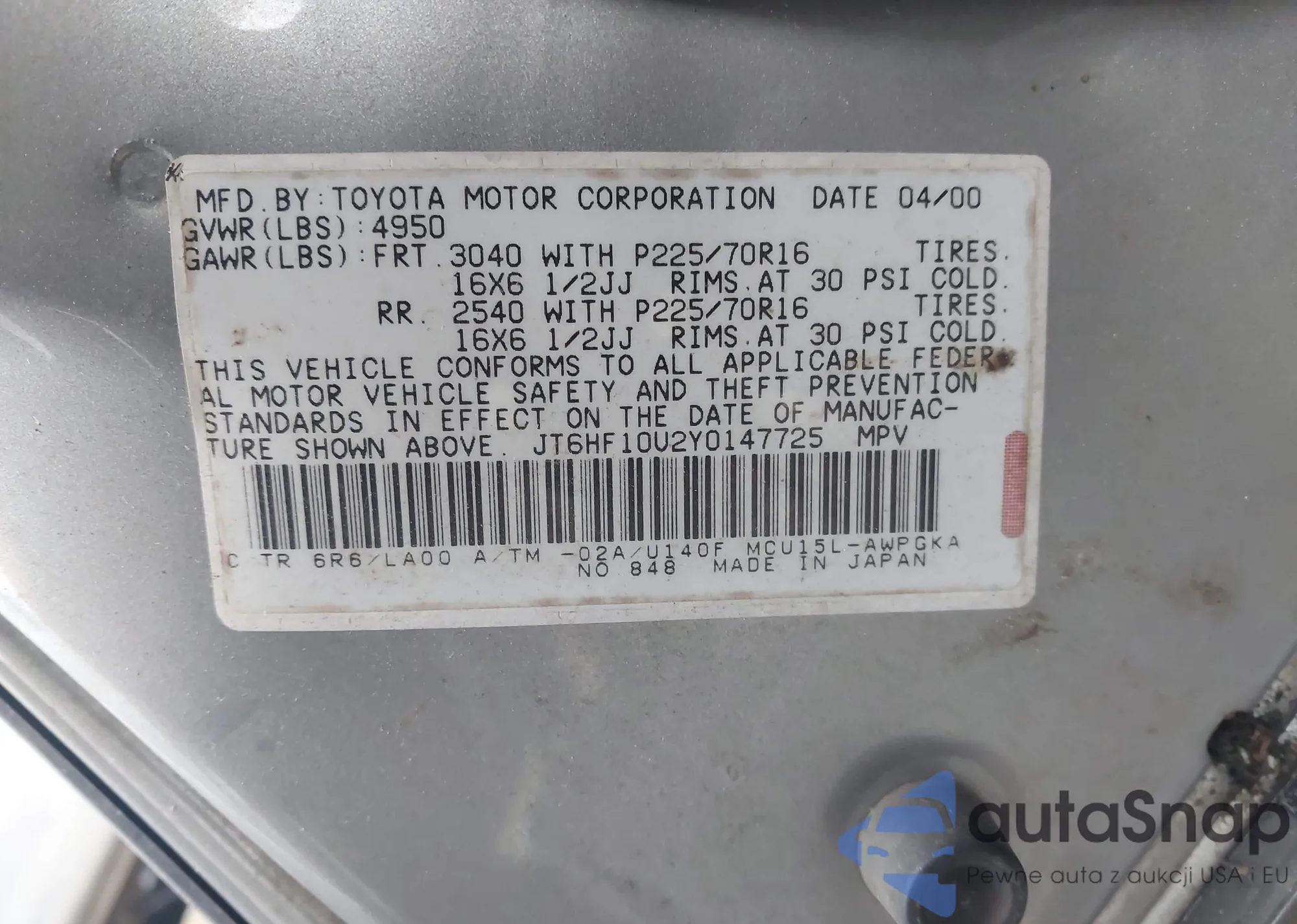 LOT: 43738354 VIN: JT6HF10U2Y0147725