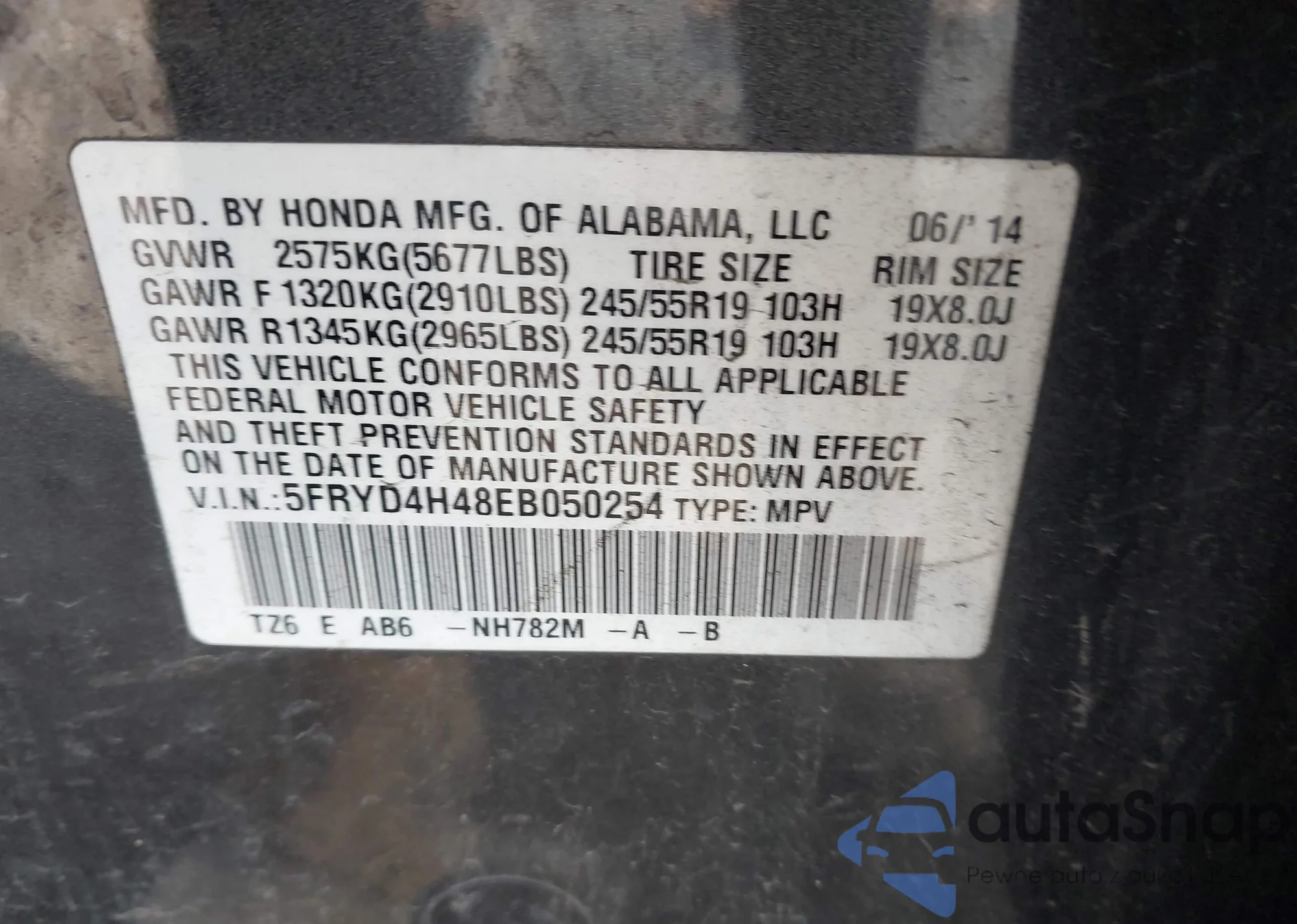LOT: 43789250 VIN: 5FRYD4H48EB050254
