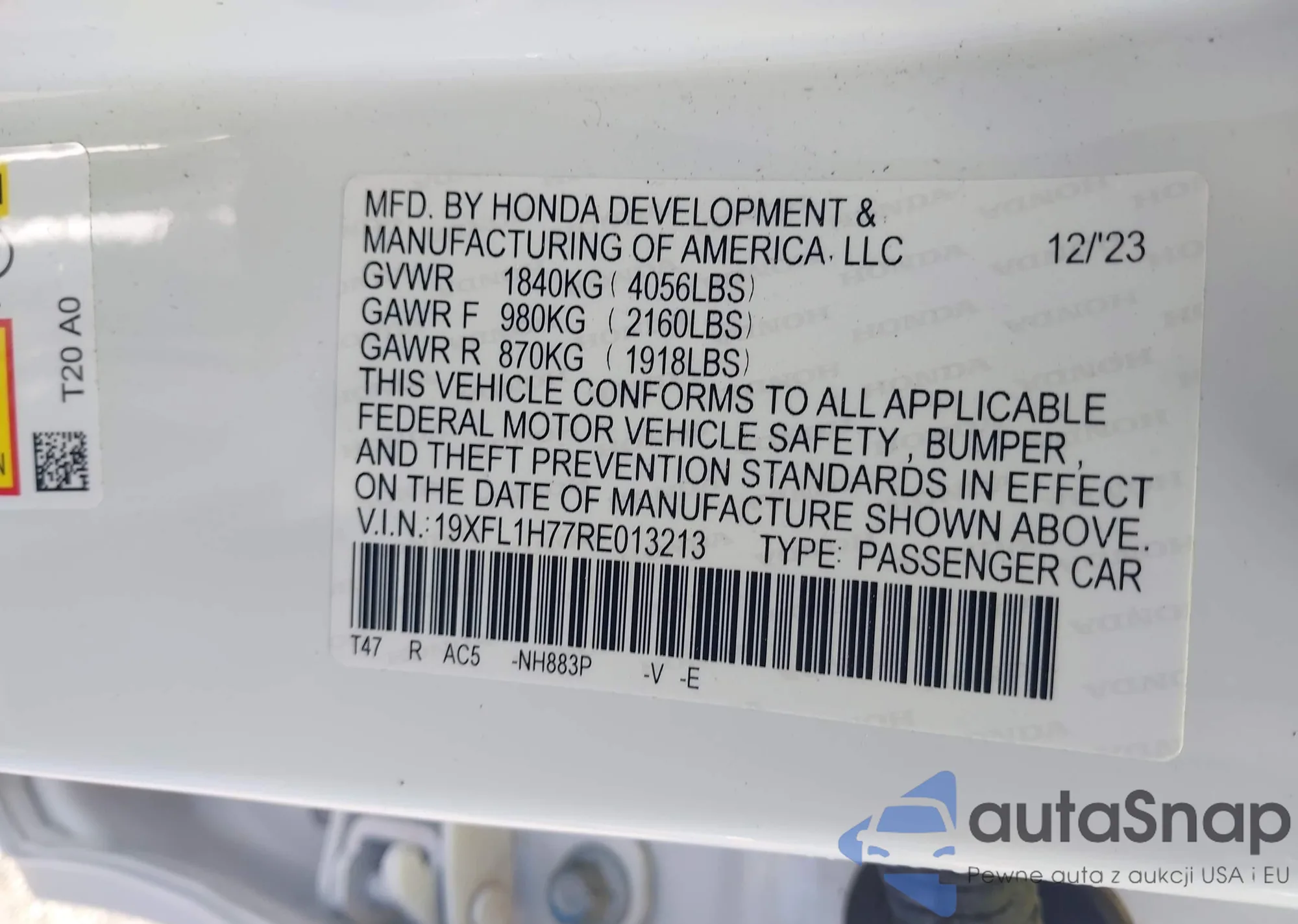 • VIN 19XFL1H77RE013213