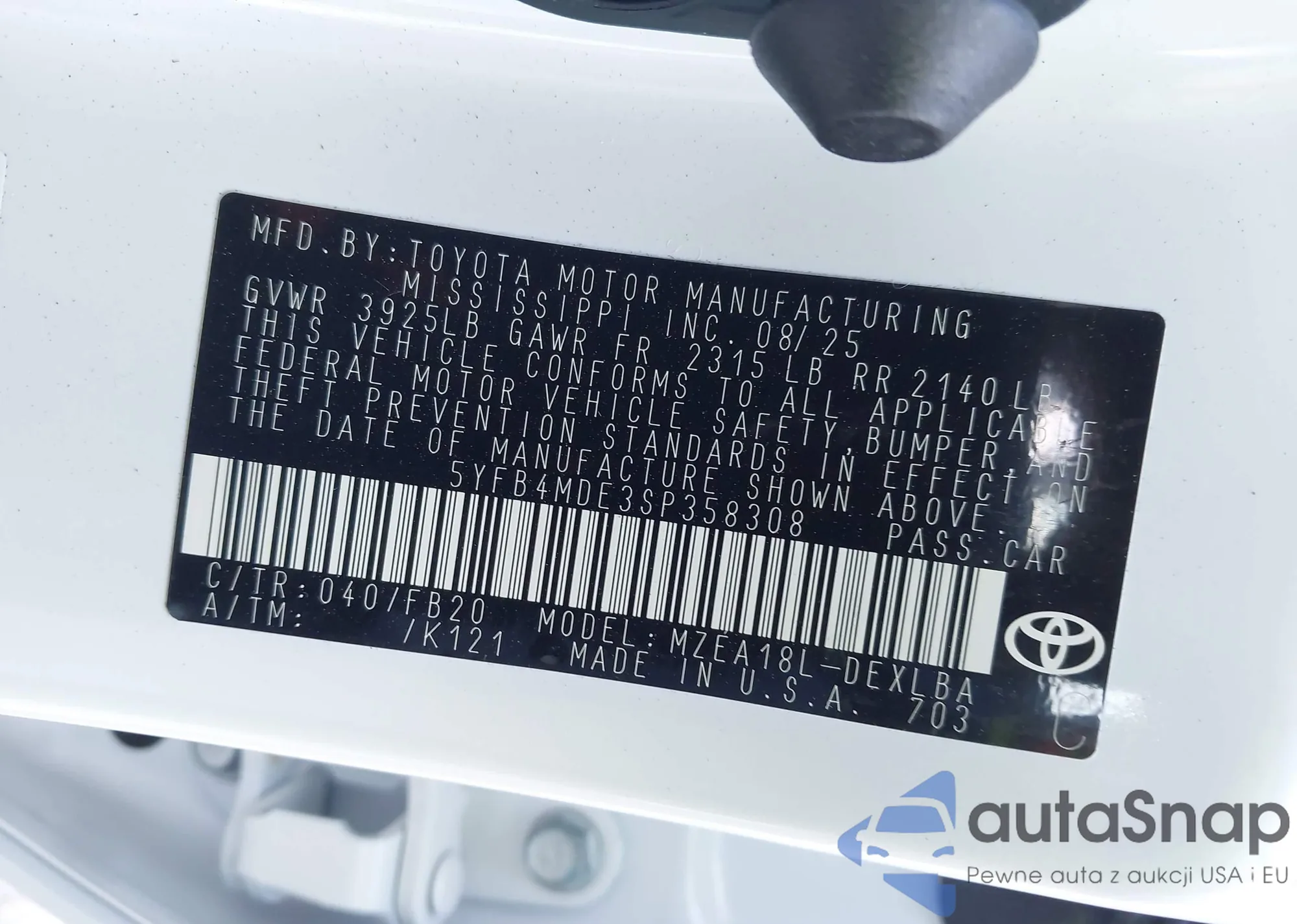 • VIN 5YFB4MDE3SP358308