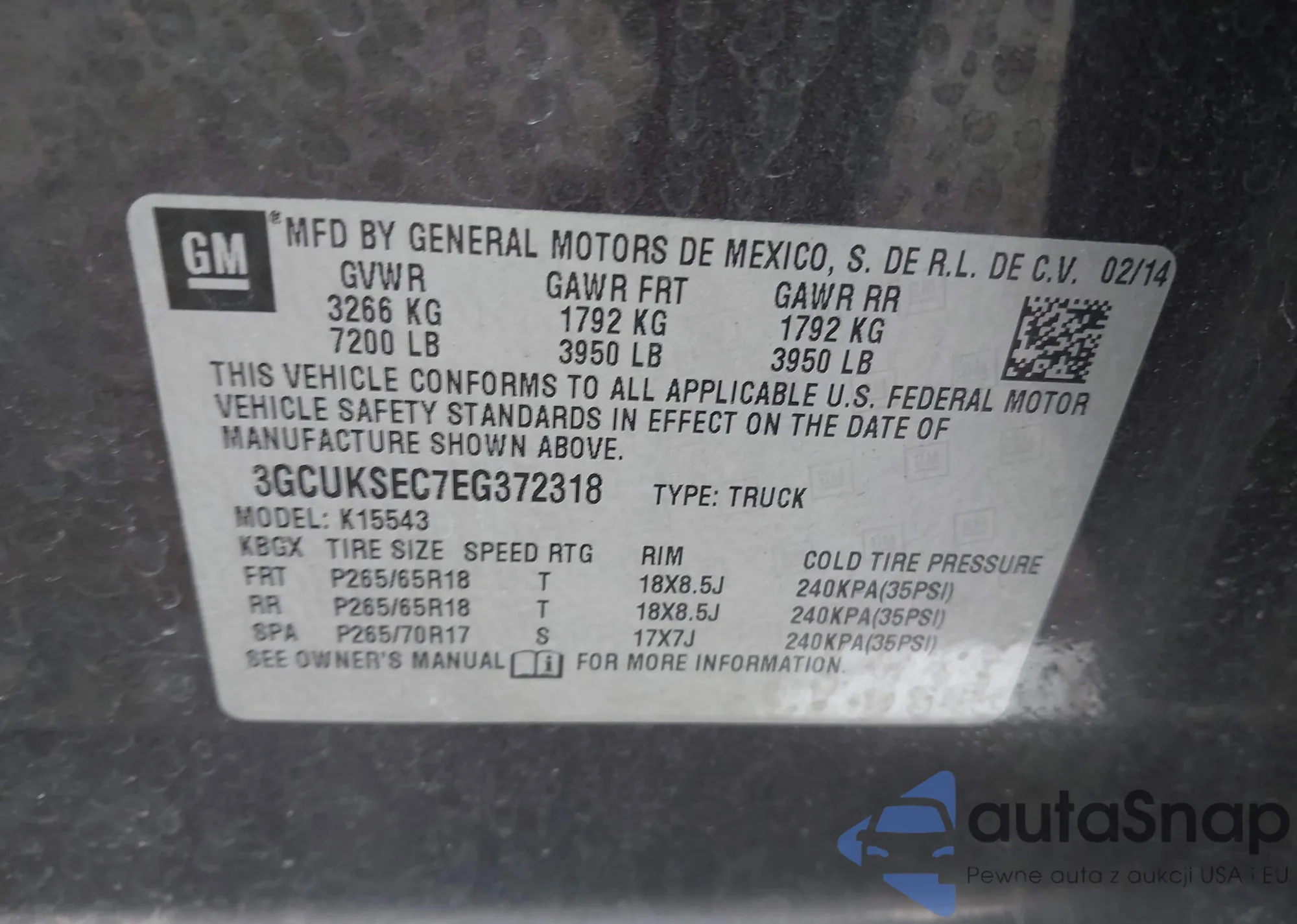 • VIN 3GCUKSEC7EG372318