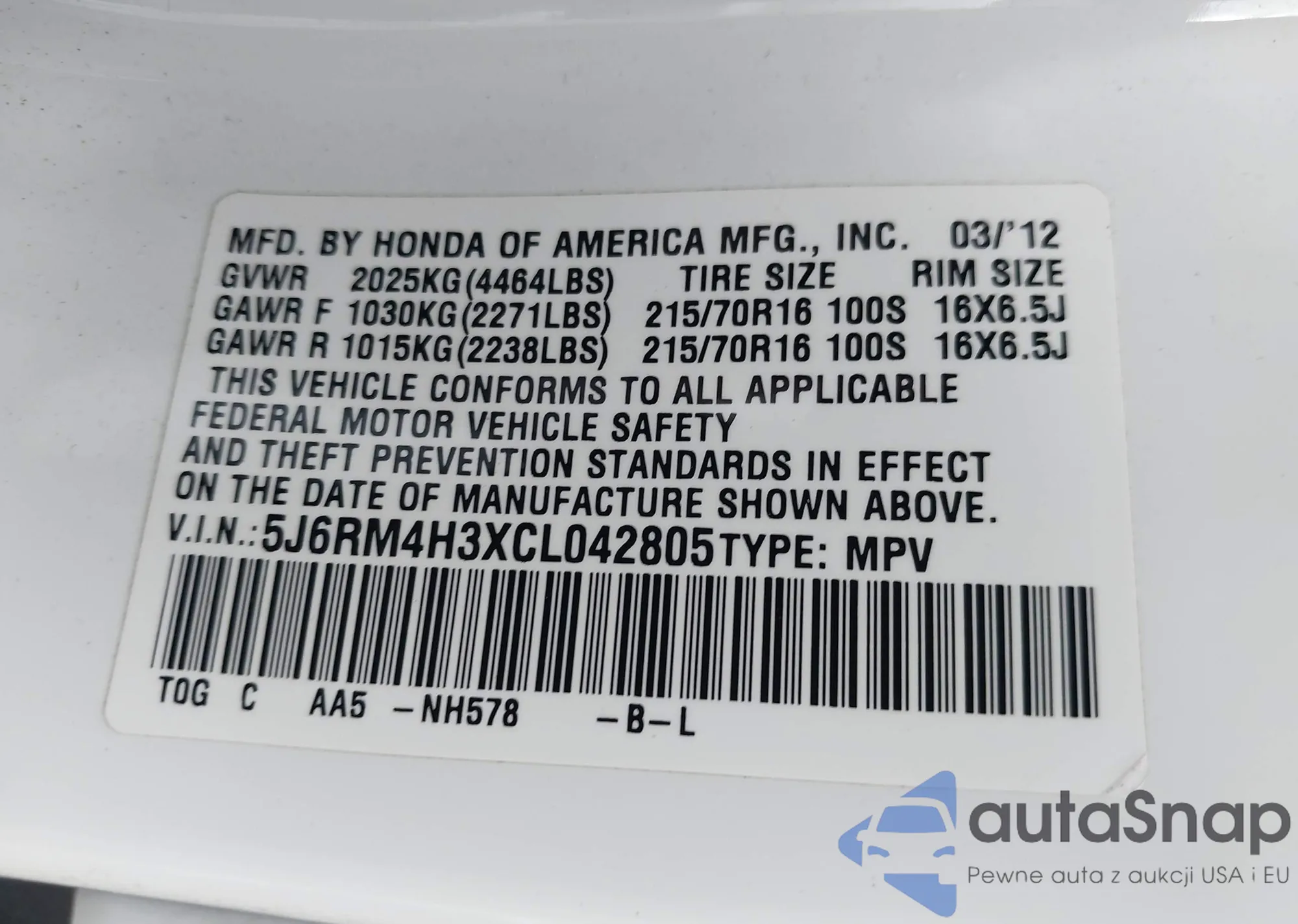 • VIN 5J6RM4H3XCL042805