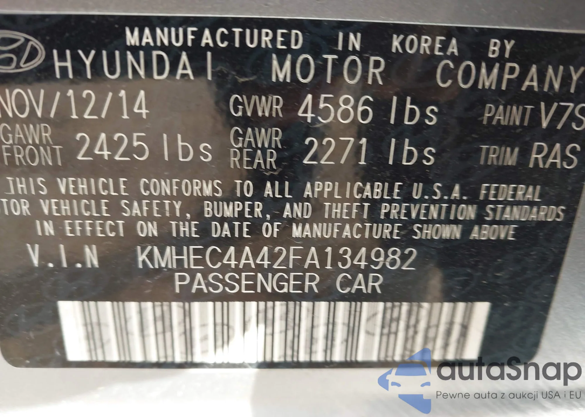LOT: 44078827 VIN: KMHEC4A42FA134982