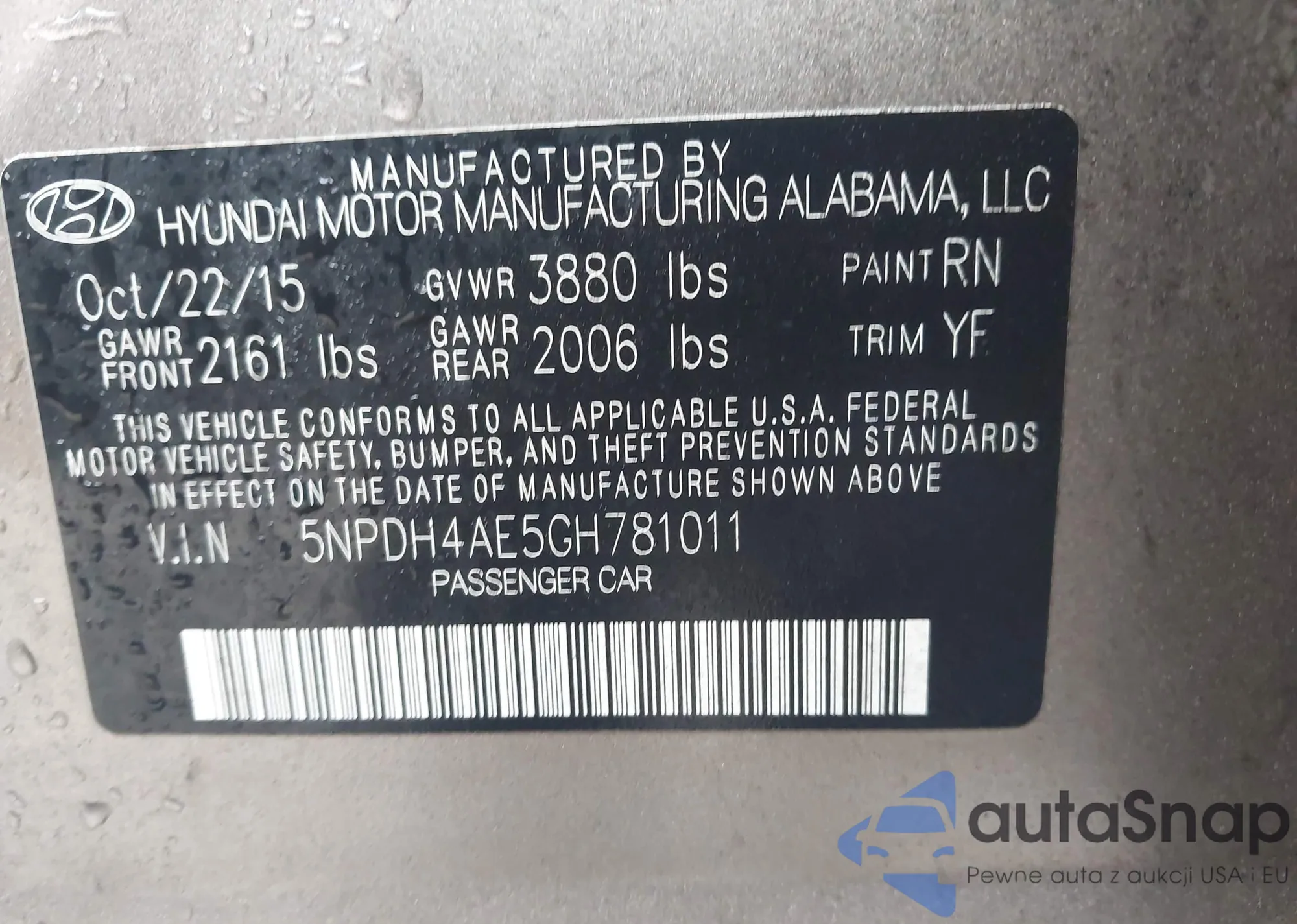LOT: 44095151 VIN: 5NPDH4AE5GH781011